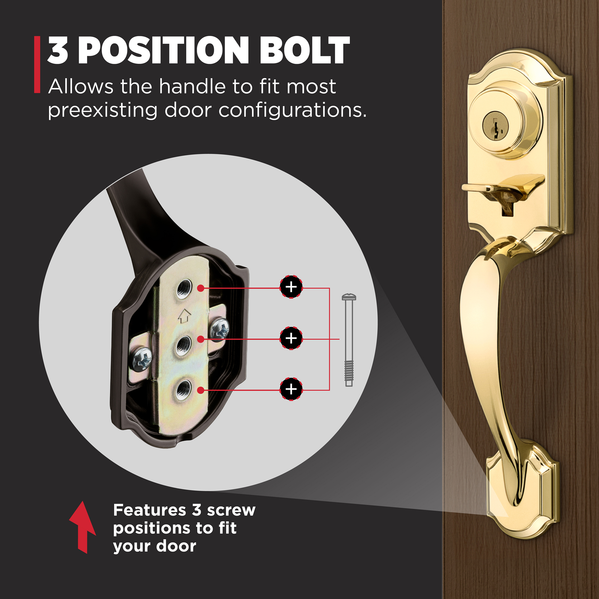 3-Position Bolt: The handle’s bottom throughbolt connection point has three vertical positions that allow the handle to fit most preexisting door configurations
