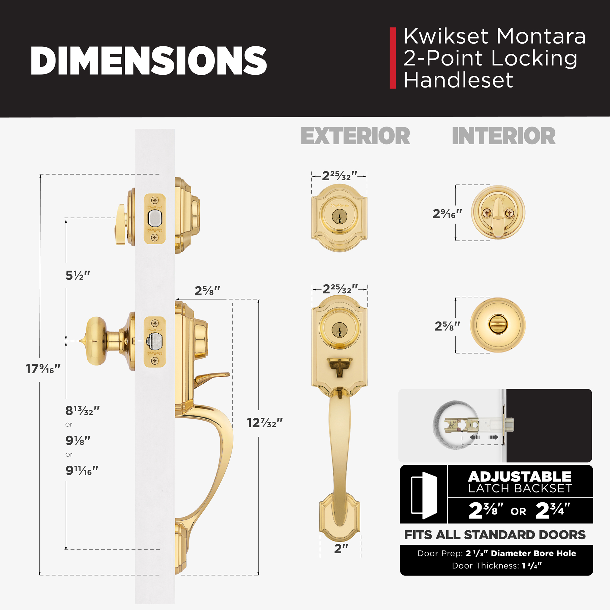 Fits Standard Doors: Fits standard size doors 1-3/4" thick, latch backset adjusts to either 2-3/8" or 2-3/4"