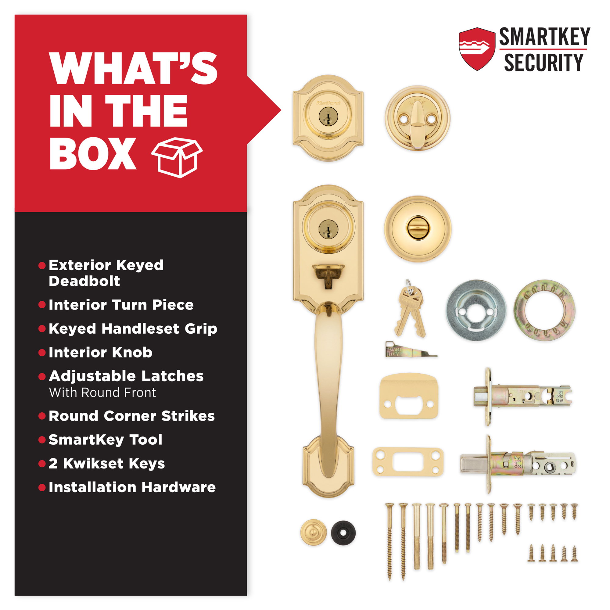 SmartKey Security™ re-key technology is compatible with Kwikset (KW1) keyway or (SC1) keyway options