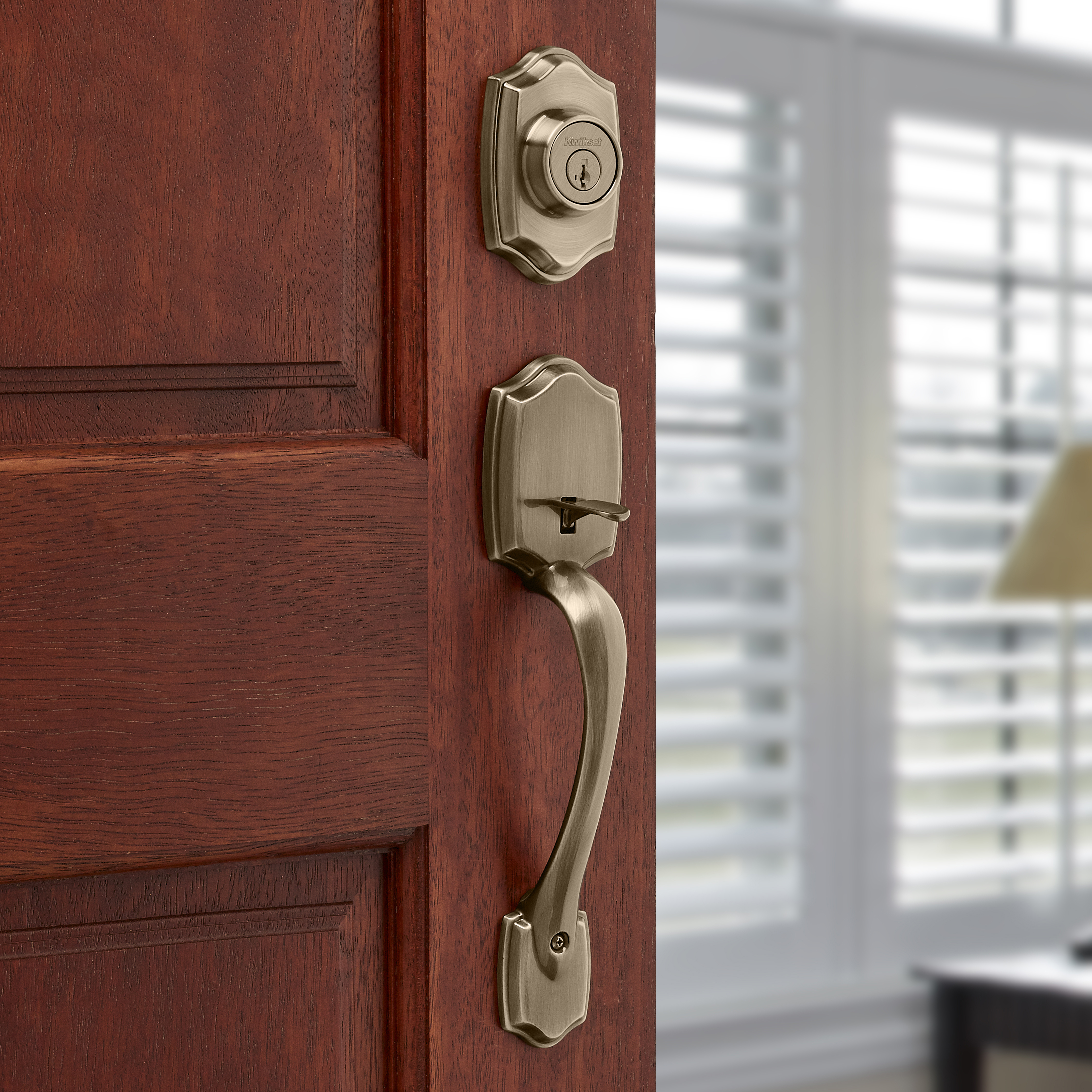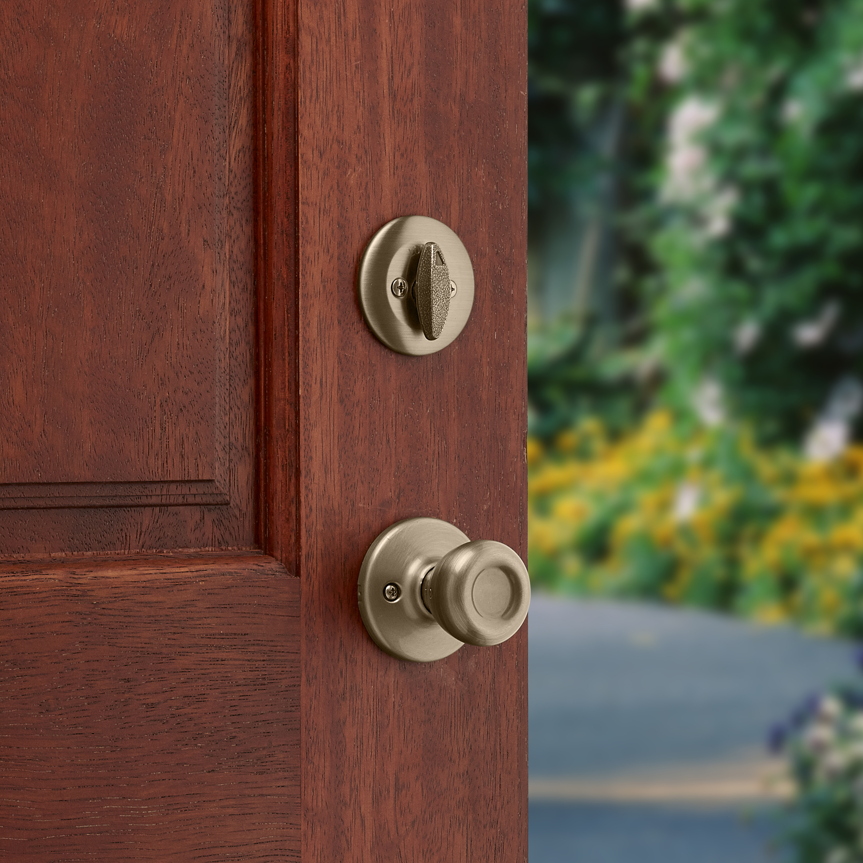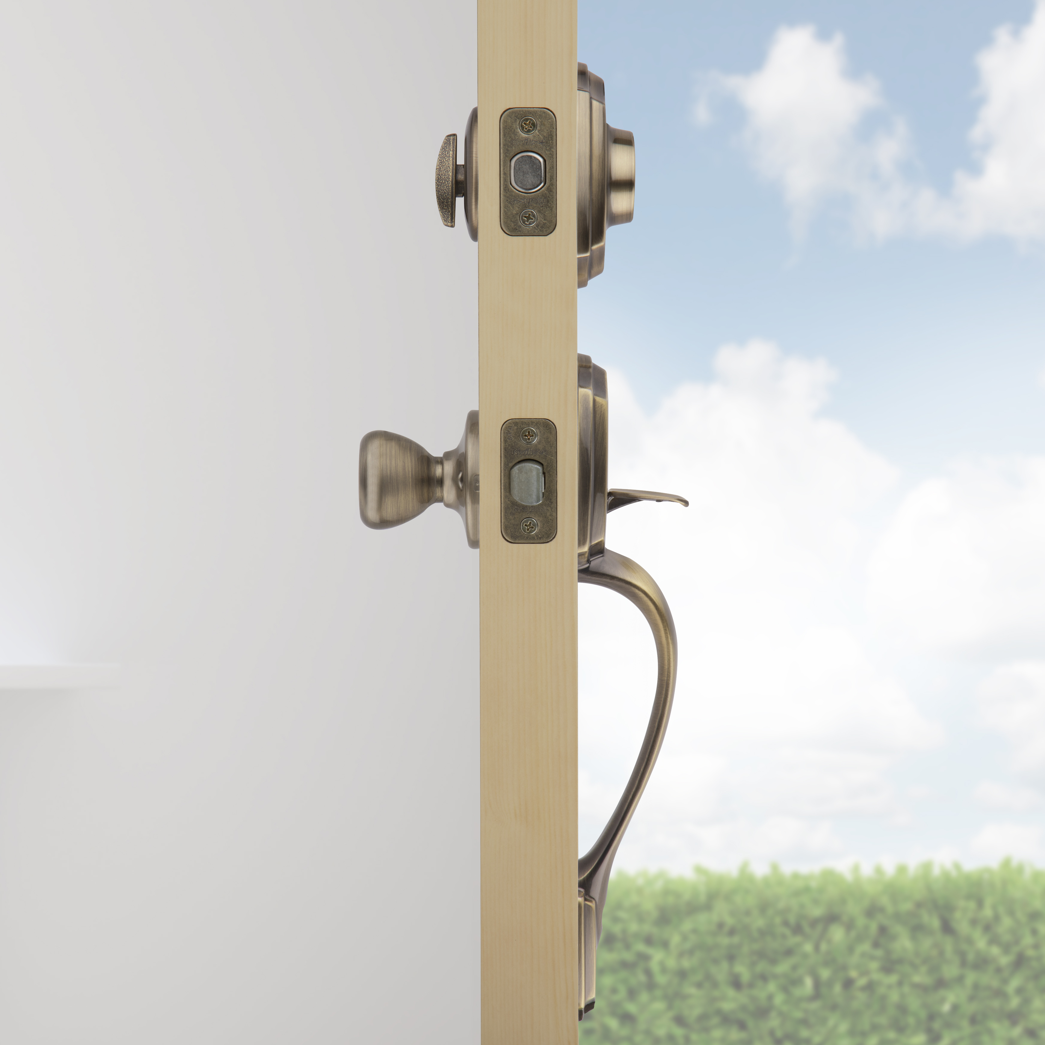 As the industry leader, Kwikset has provided trusted security for over 70 years and has become synonymous with security, peace of mind, style and innovation. The beveled design of the Belleview adds elegance to its traditional arched shape. The latch bolt is operated by the thumb piece on the outside and the grip on the inside. The deadbolt is operated by a key on the outside and a thumb turn on the inside.