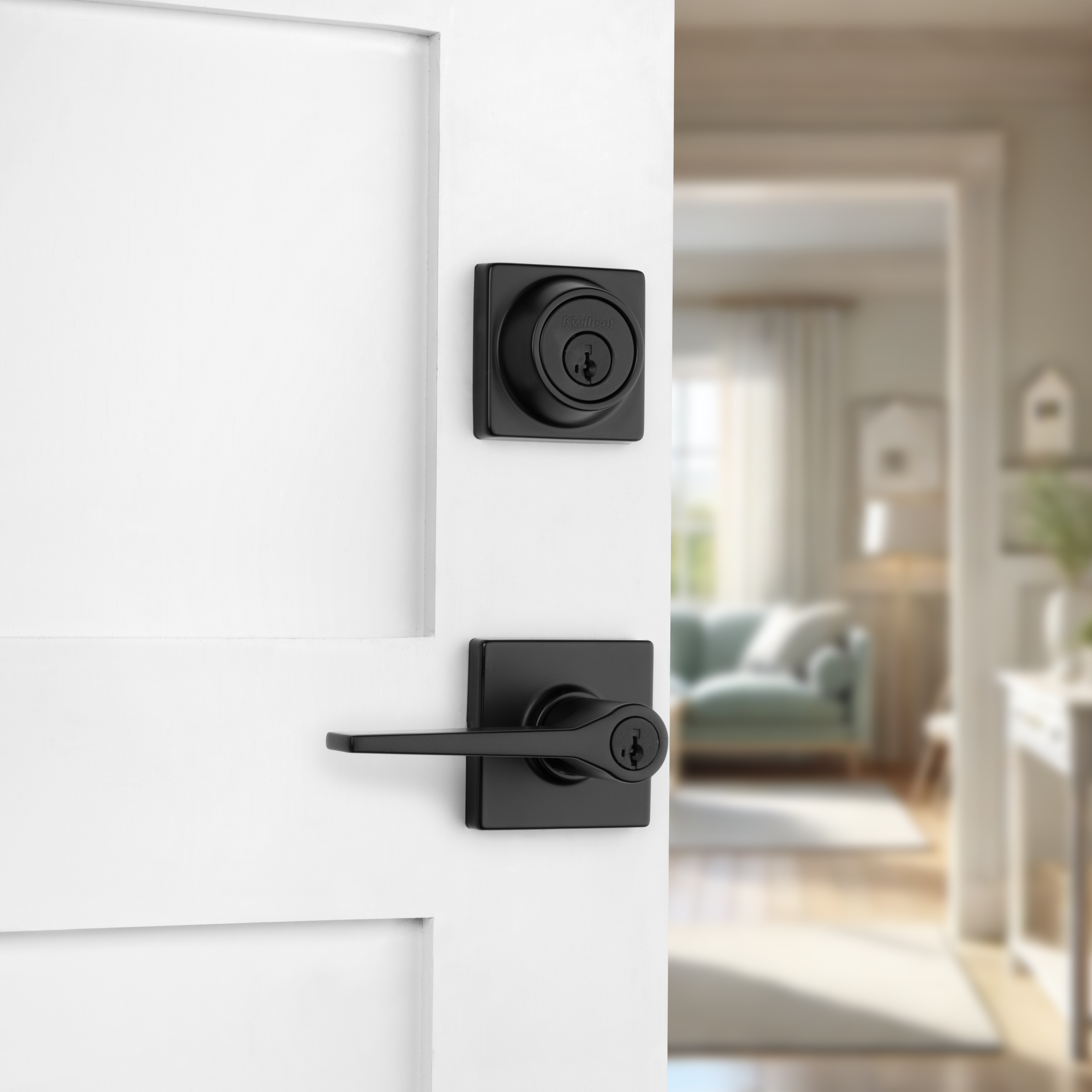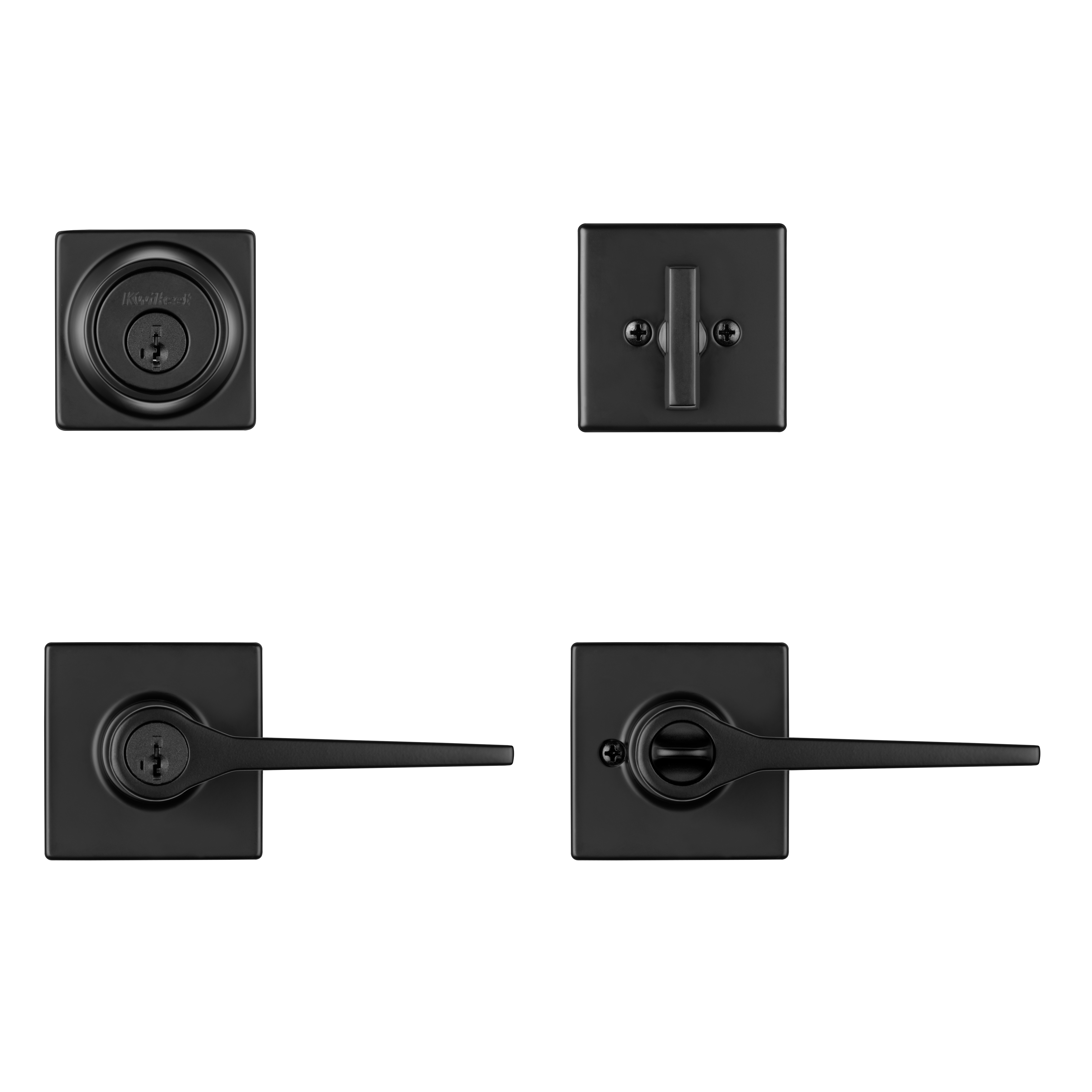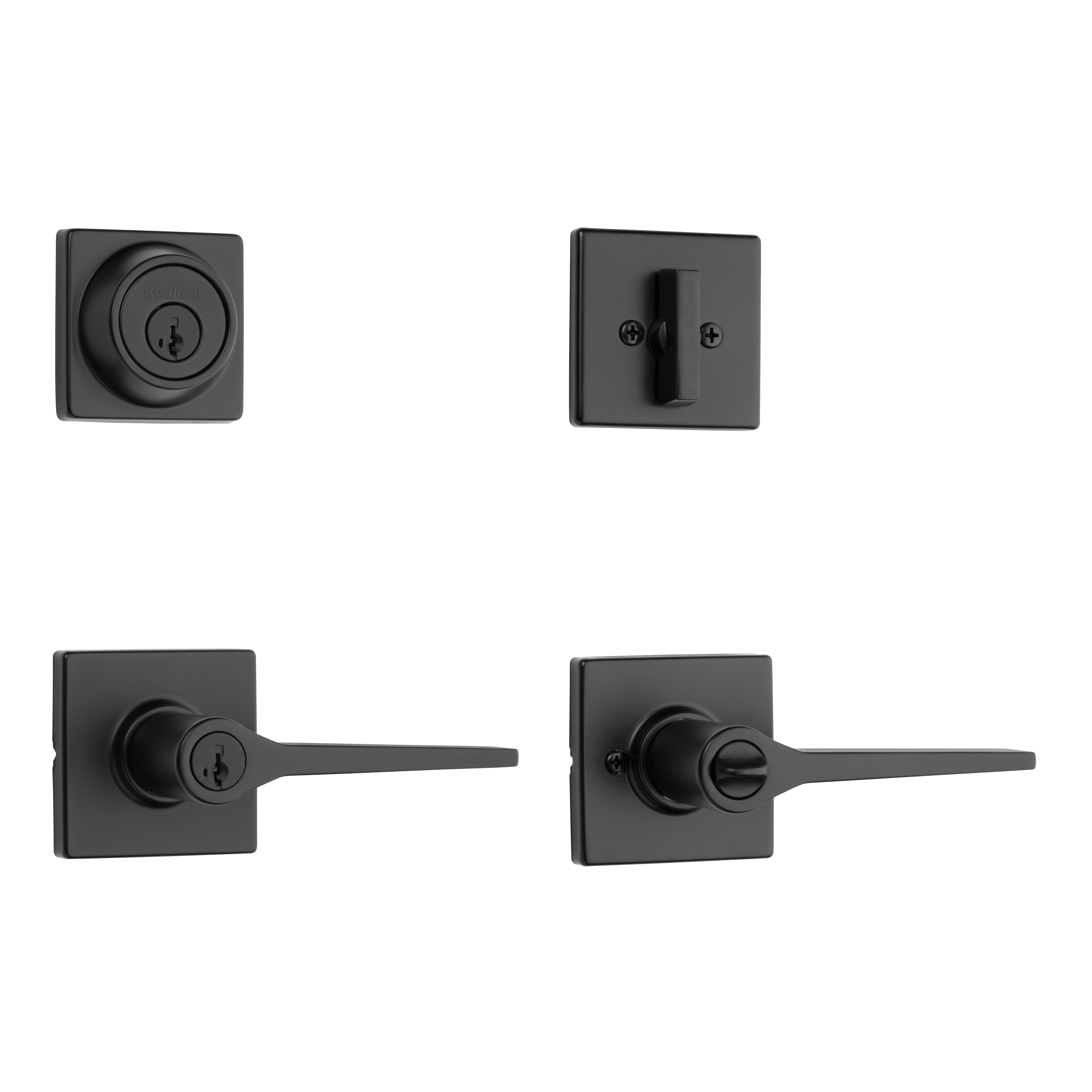 Box Includes: Box Includes deadbolt, lever, Adjustable Latches with round and square front options or drive-in collar, round corner strikes, SmartKey tool, 2 Kwikset keys, screws and Allen wrench