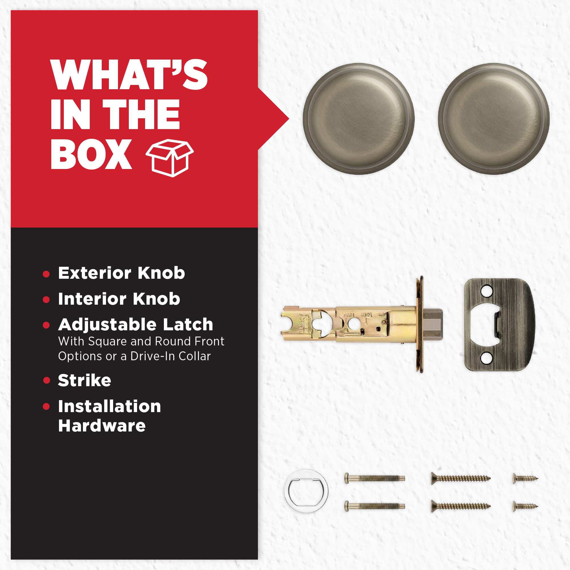 Box Includes: Box Includes passage knob, Adjustable Latch with round and square front options or drive-in collar, round corner strike, designer rosette, screws and Allen wrench
