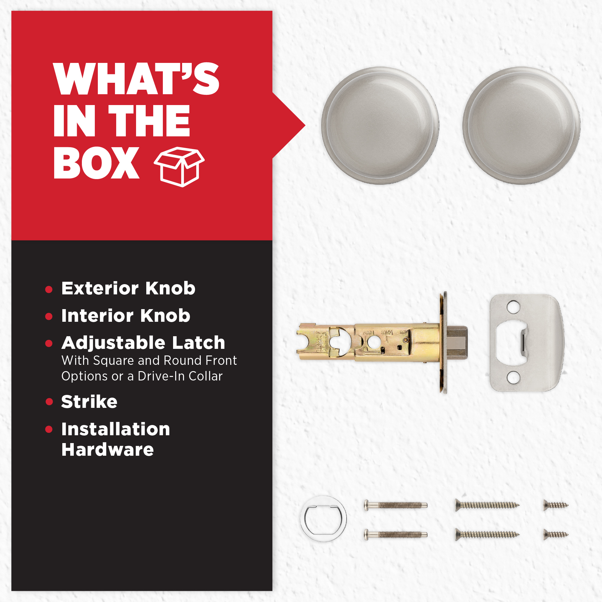 Box Includes: Box Includes passage knob, Adjustable Latch with round and square front options or drive-in collar, round corner strike, designer rosette, screws and Allen wrench