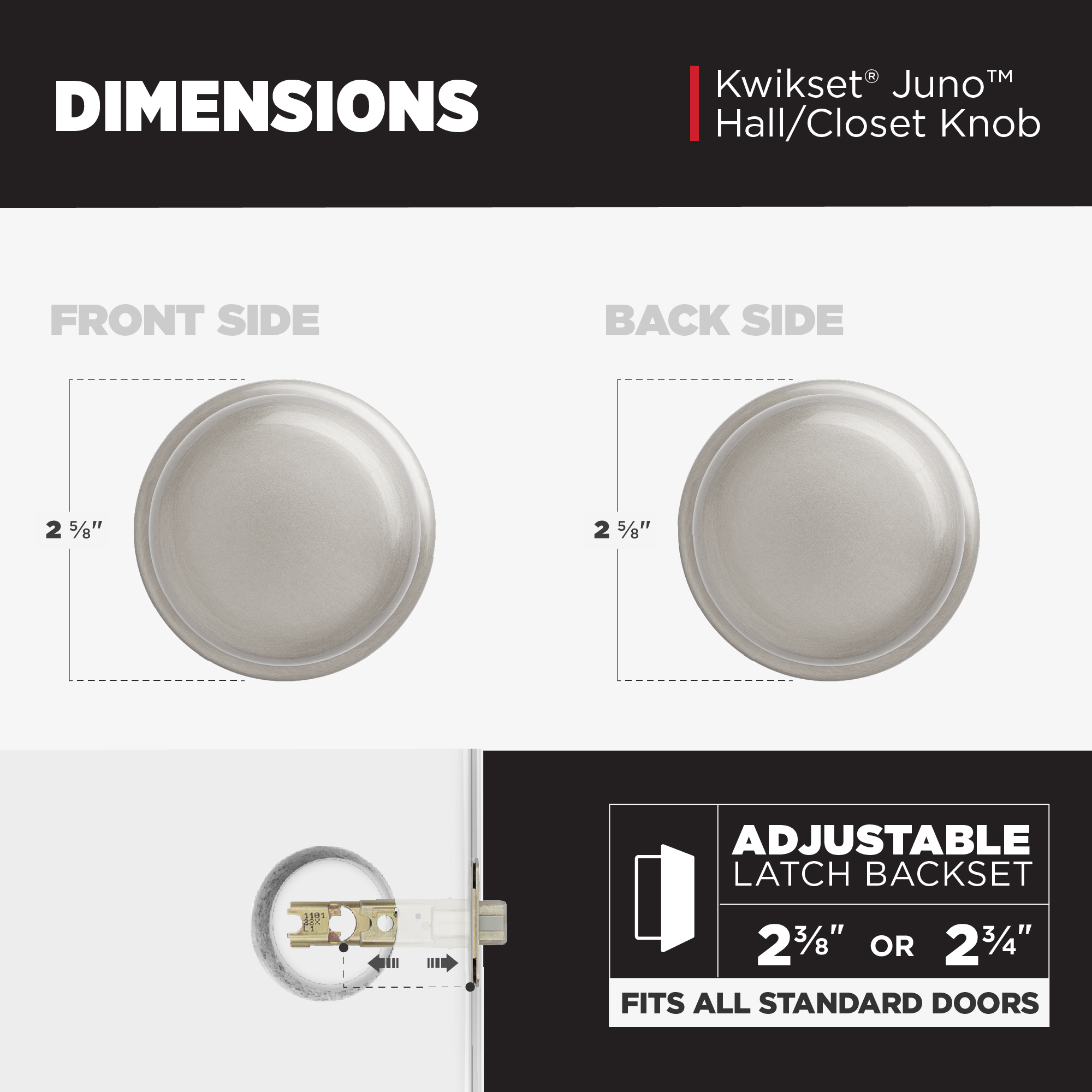Fits Standard Door: Fits standard size doors 1-3/8" to 1-3/4" thick, latch backset adjusts to either 2-3/8" or 2-3/4" by sliding the adjustment pin during installation