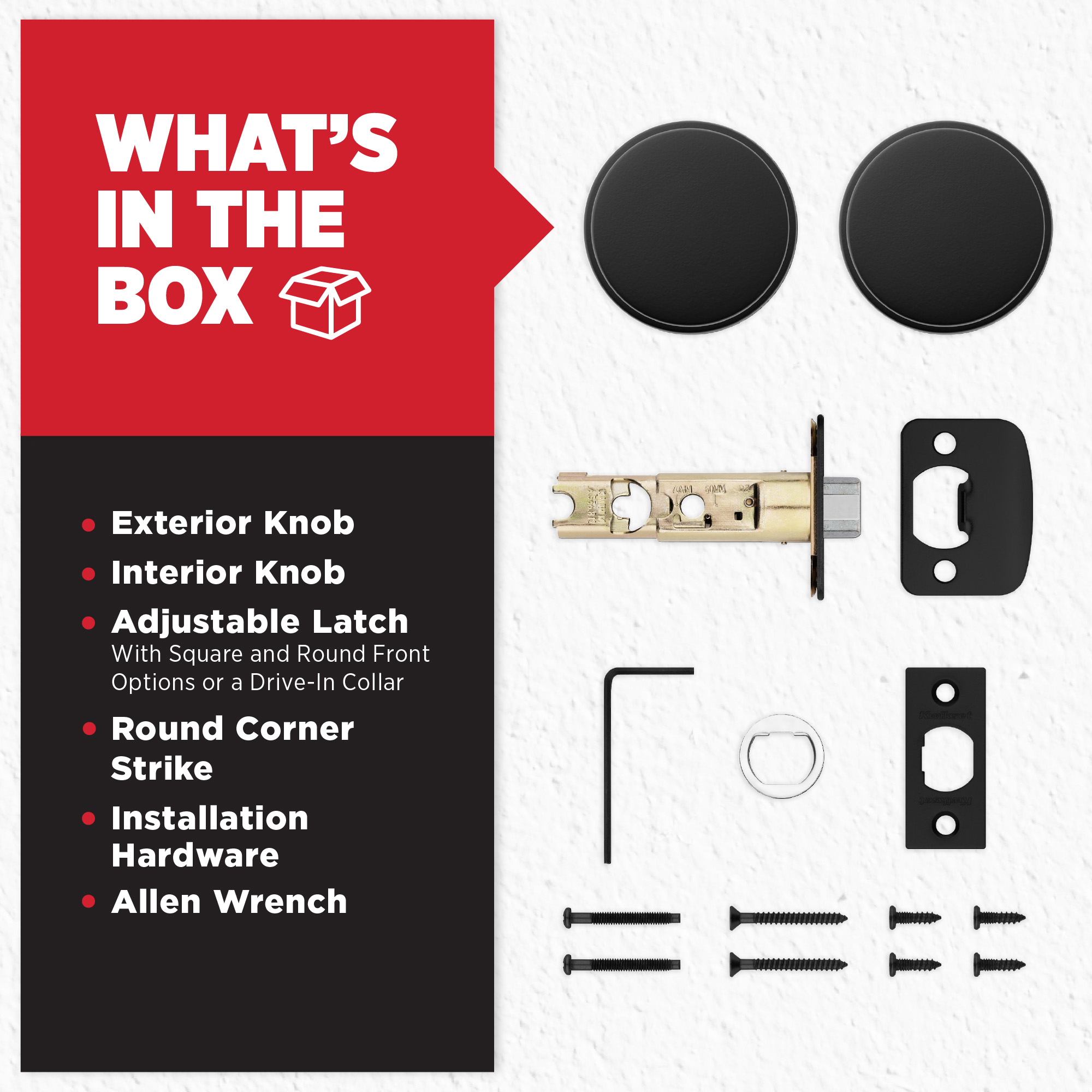 Box Includes: Box includes passage knob, adjustable latch with round and square front options or drive-in collar, round corner strike, designer rosette, screws and Allen wrench