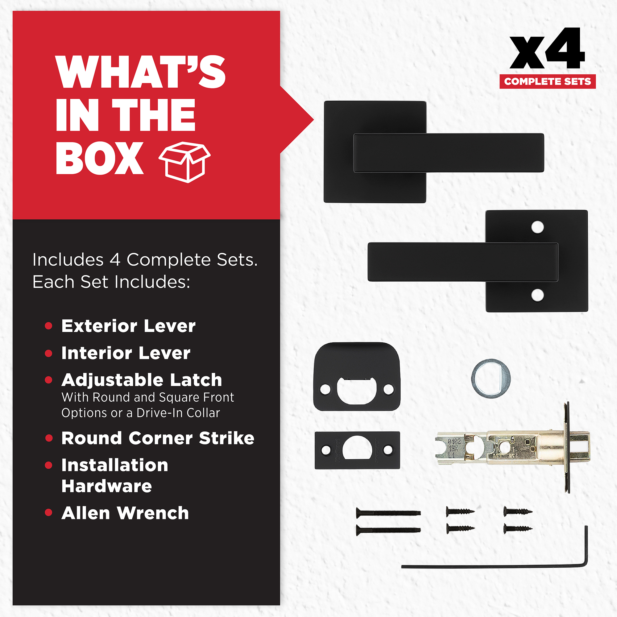 Box Includes: Box Includes passage lever, Adjustable Latch with round and square front options or drive-in collar, round corner strike, designer rosette, screws and Allen wrench