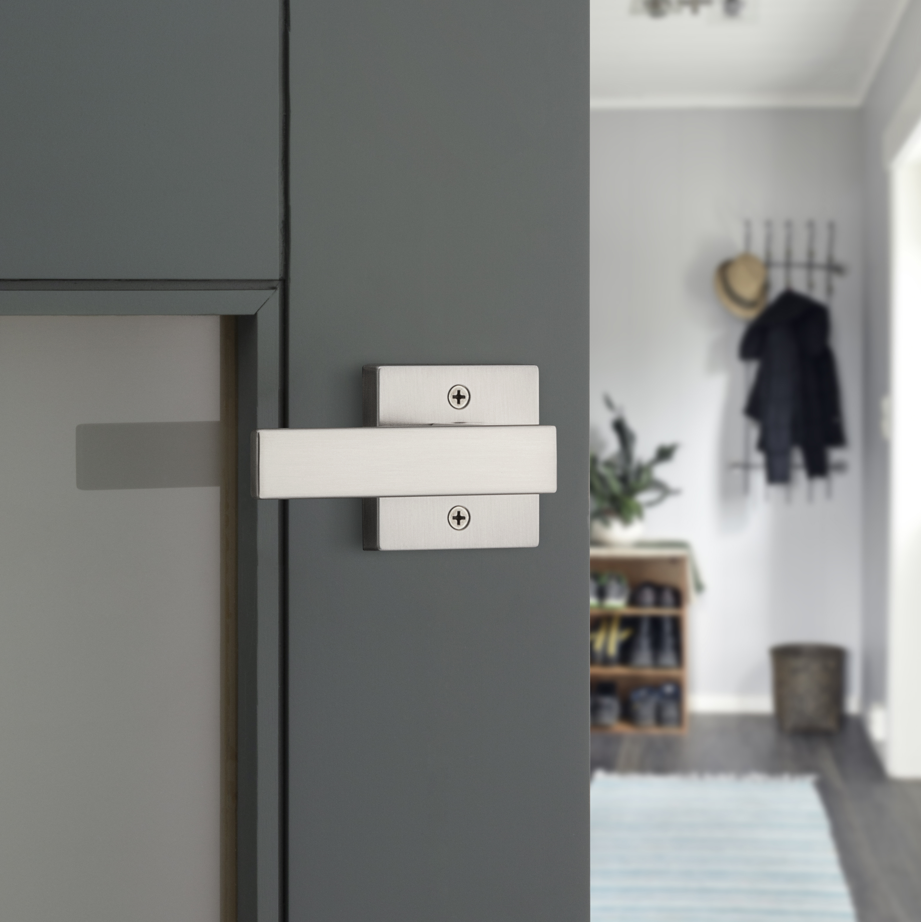 Singapore Hall/Closet Door Lever with Square Rosette in Satin Nickel
