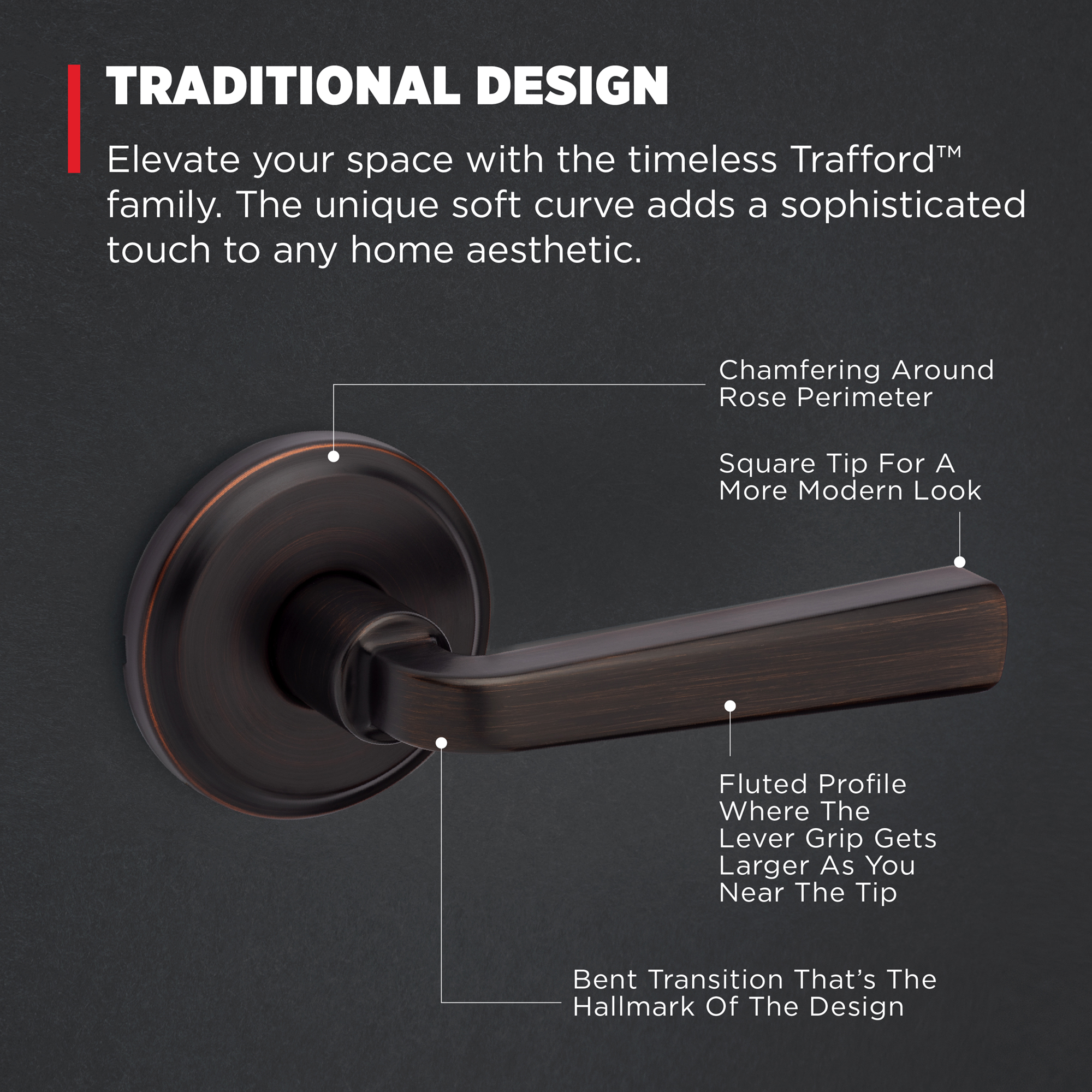 Step up to designer styles and superior security with Kwikset Signature Series products. Elevate your space with the timeless Trafford™ family. The unique soft curve adds a sophisticated touch to any home aesthetic, while the designer rosette imparts a warm and welcoming feel to your doors. Create your desired look with three premium finishes, then let our bump- and pick-resistant SmartKey® Security protect what matters most. Adorn your interior and exteriors with Trafford™ levers, and enjoy our highest level of security, easiest installation and peace of mind.