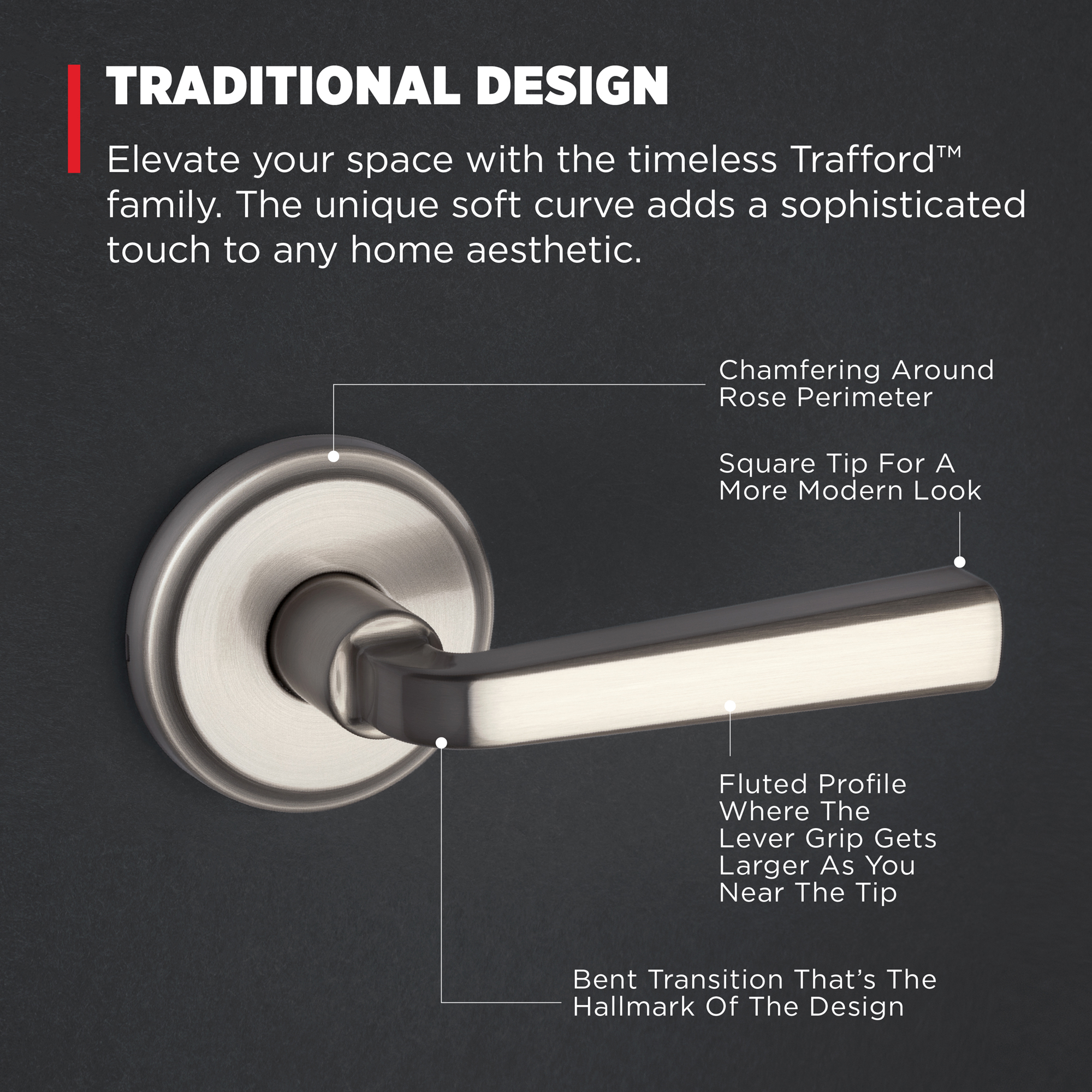 | Product Description | Step up to designer styles and superior security with Kwikset Signature Series products. Elevate your space with the timeless Trafford™ family. The unique soft curve adds a sophisticated touch to any home aesthetic, while the designer rosette imparts a warm and welcoming feel to your doors. Create your desired look with three premium finishes, then let our bump- and pick-resistant SmartKey® Security protect what matters most. Adorn your interior and exteriors with Trafford™ levers, and enjoy our highest level of security, easiest installation and peace of mind. |