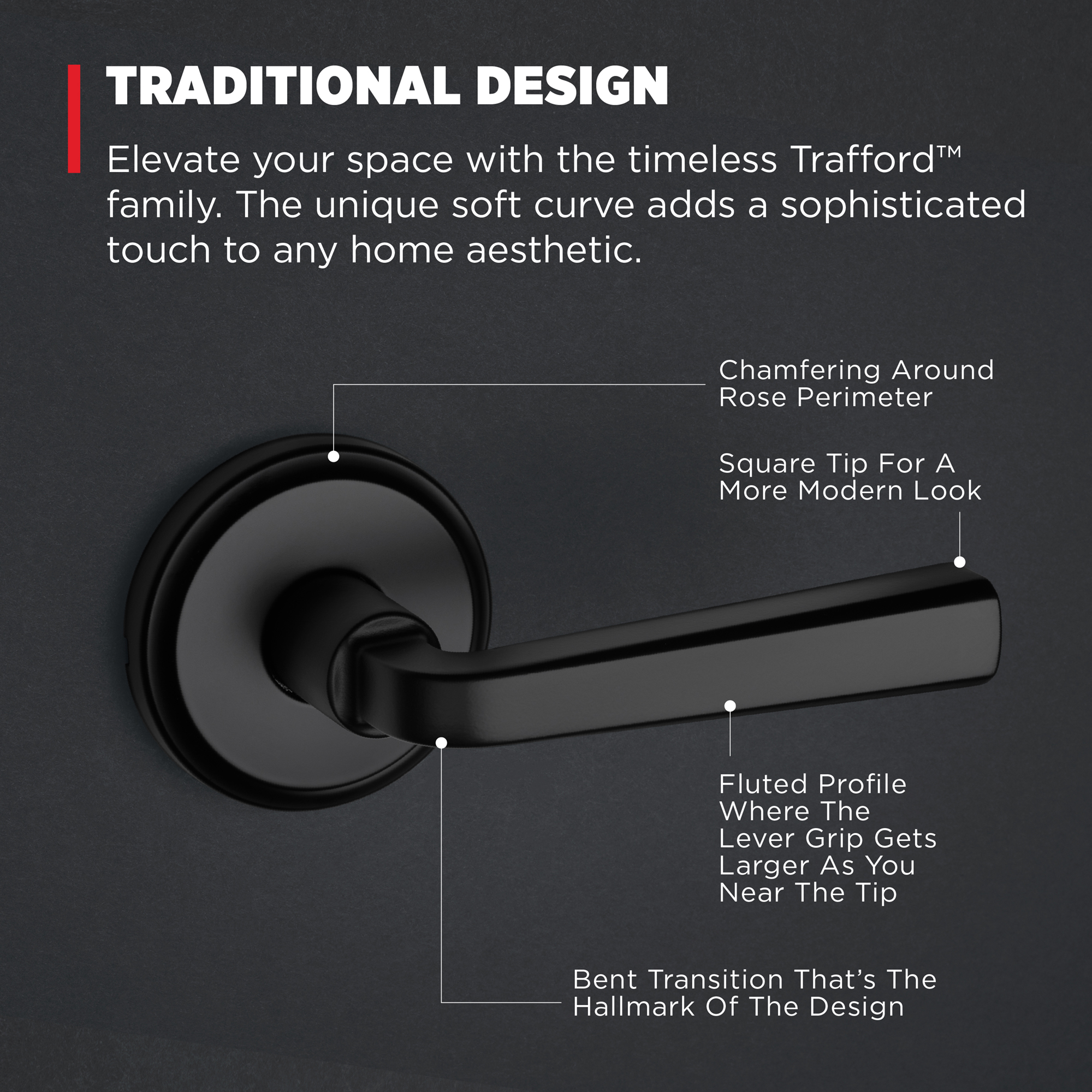 Step up to designer styles and superior security with Kwikset Signature Series products. Elevate your space with the timeless Trafford™ family. The unique soft curve adds a sophisticated touch to any home aesthetic, while the designer rosette imparts a warm and welcoming feel to your doors. Create your desired look with three premium finishes, then let our bump- and pick-resistant SmartKey® Security protect what matters most. Adorn your interior and exteriors with Trafford™ levers, and enjoy our highest level of security, easiest installation and peace of mind.