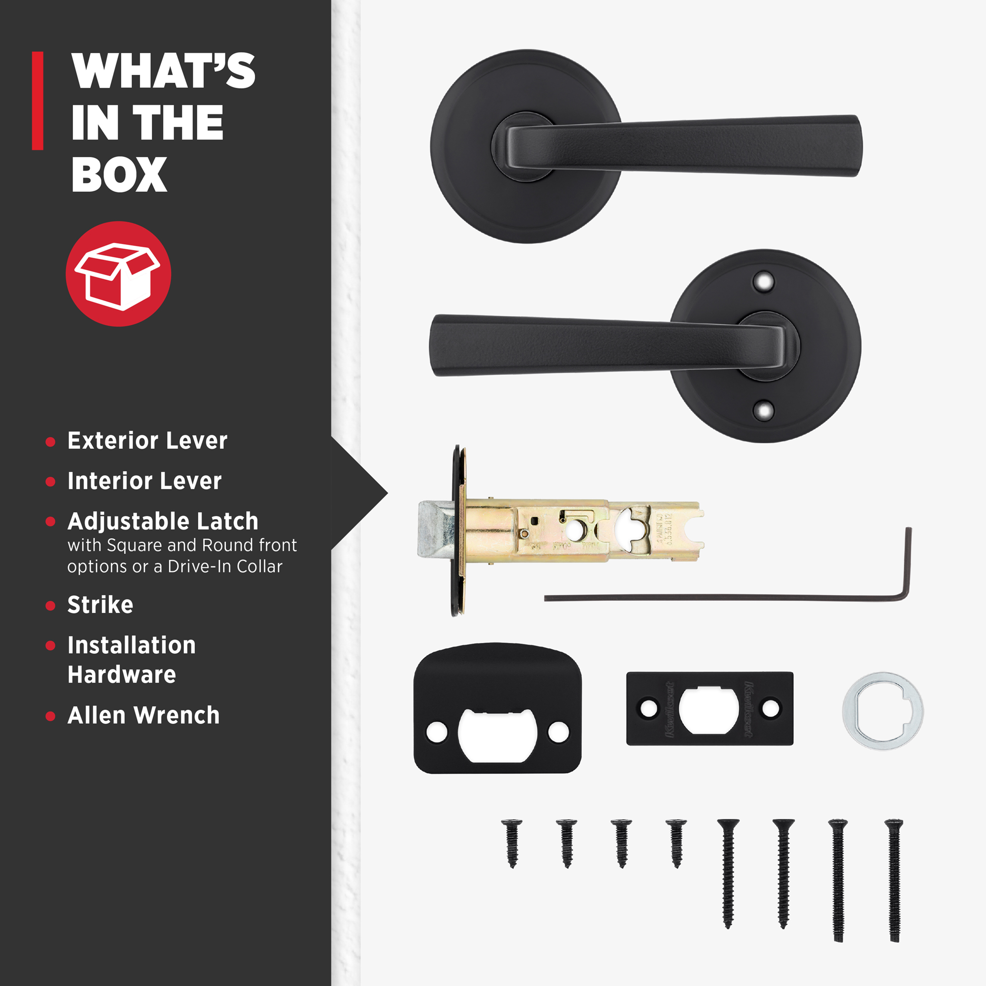 Box Includes: Box Includes passage lever, Adjustable Latch with round and square front options or drive-in collar, round corner strike, designer rosette, screws and Allen wrench