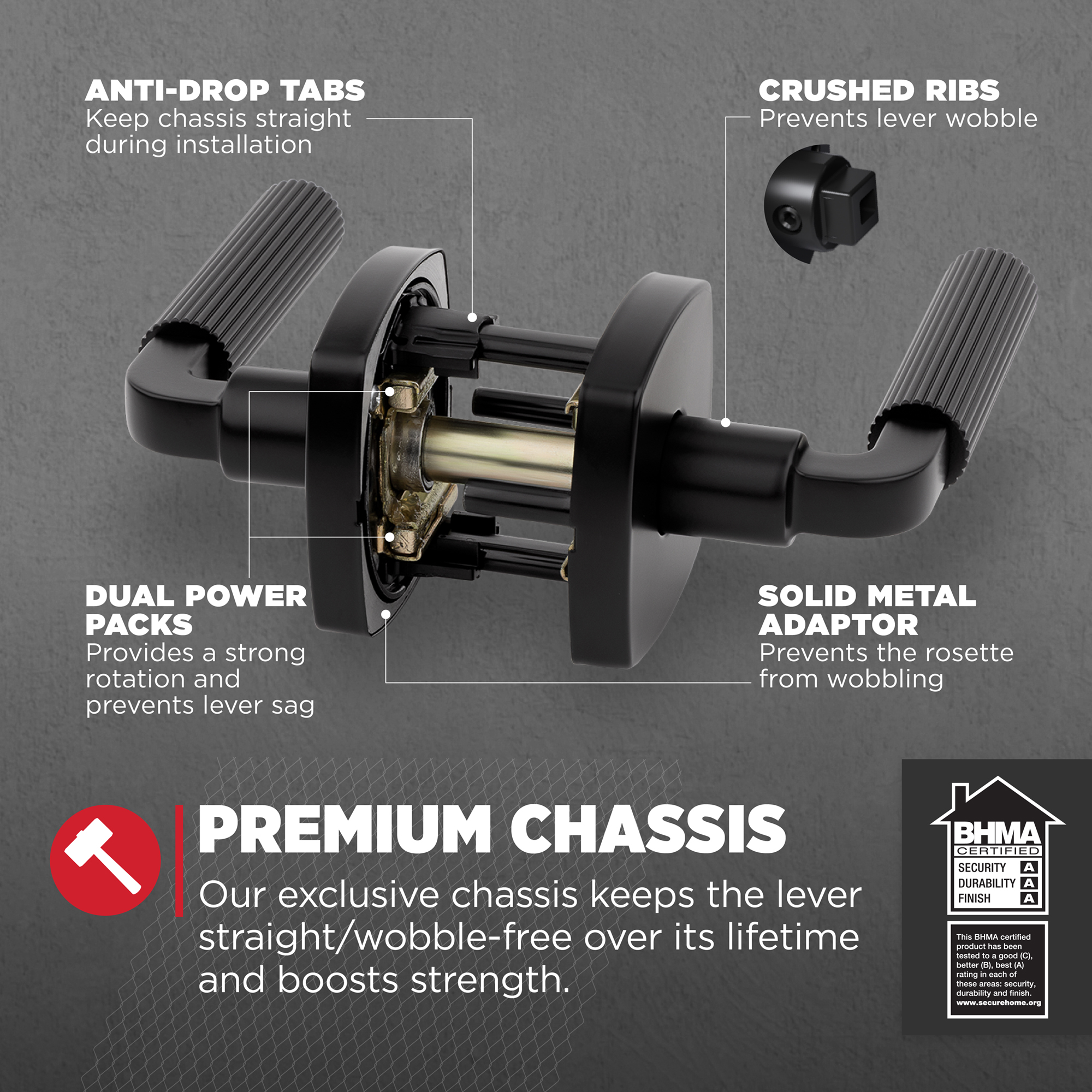- Premium Chassis: Kwikset’s exclusive chassis uses dual compression springs, keeping the lever straight and wobble-free over the lifetime of the product and enhancing its strength and rotational feel