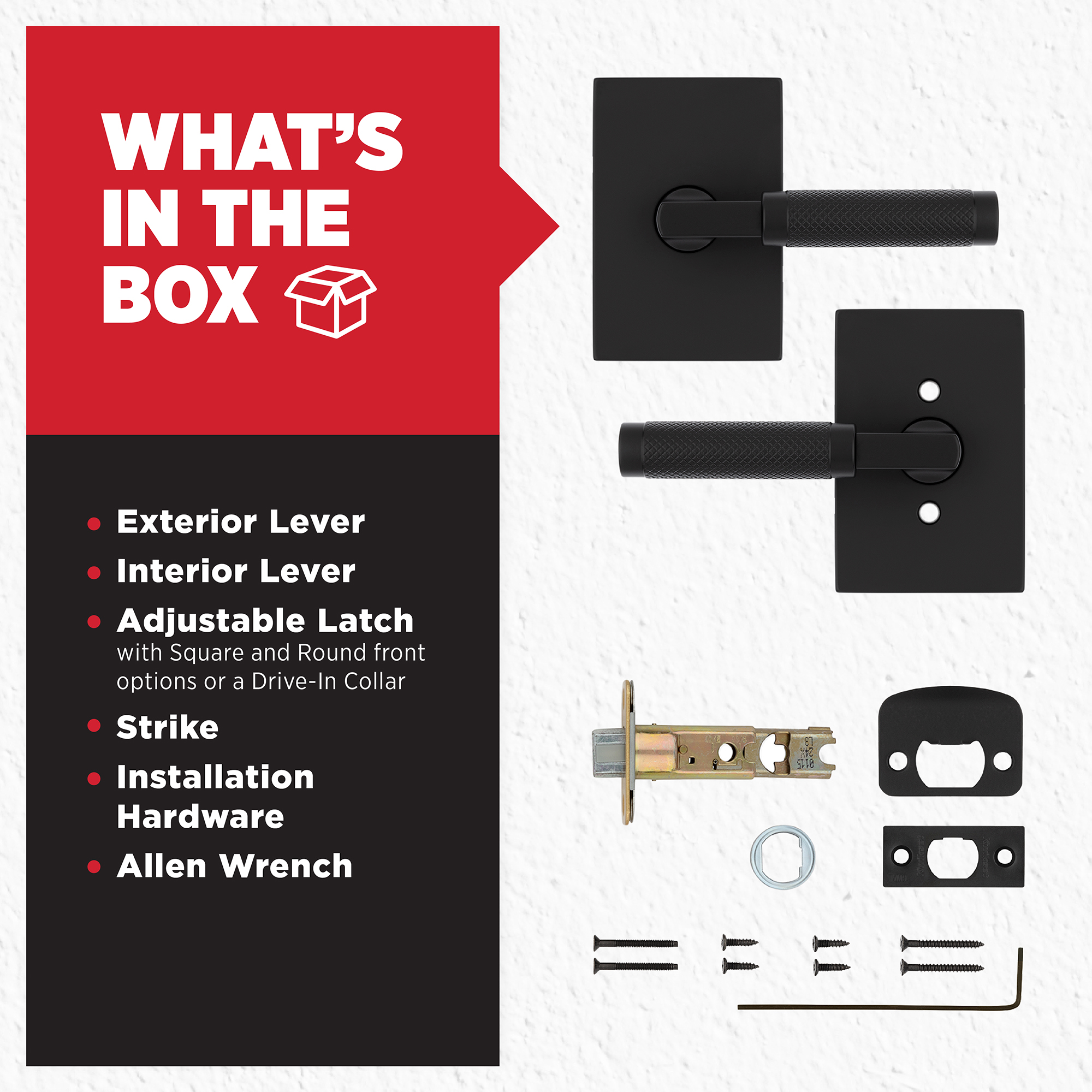 - Box Includes: Box Includes passage lever, Adjustable Latch with round and square front options or drive-in collar, round corner strike, designer rosette, screws and Allen wrench