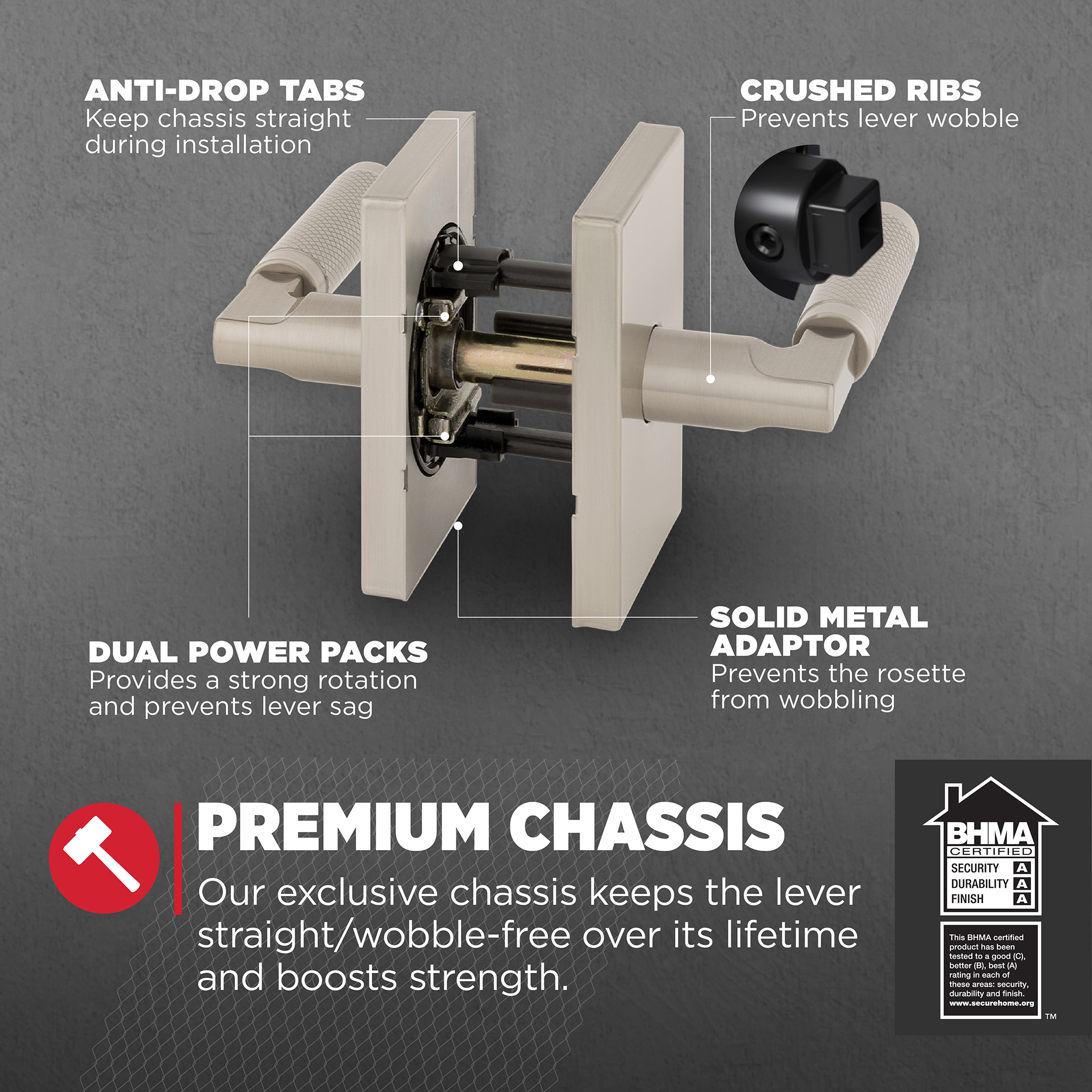 - Adjustable Latch: By sliding the adjustment pin during installation, the latch backset can be adjusted to either 2-3/8" or 2-3/4" in order to fit all standard door preparations