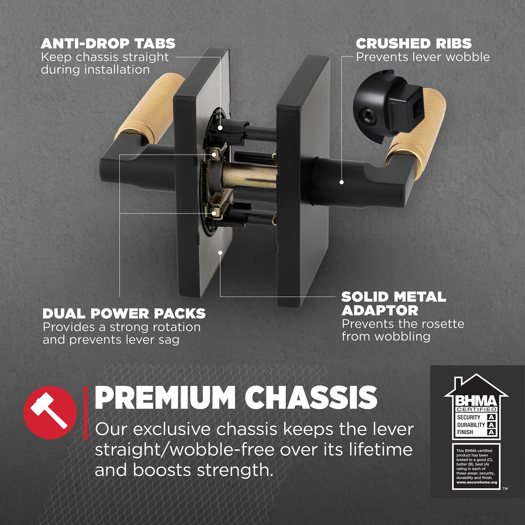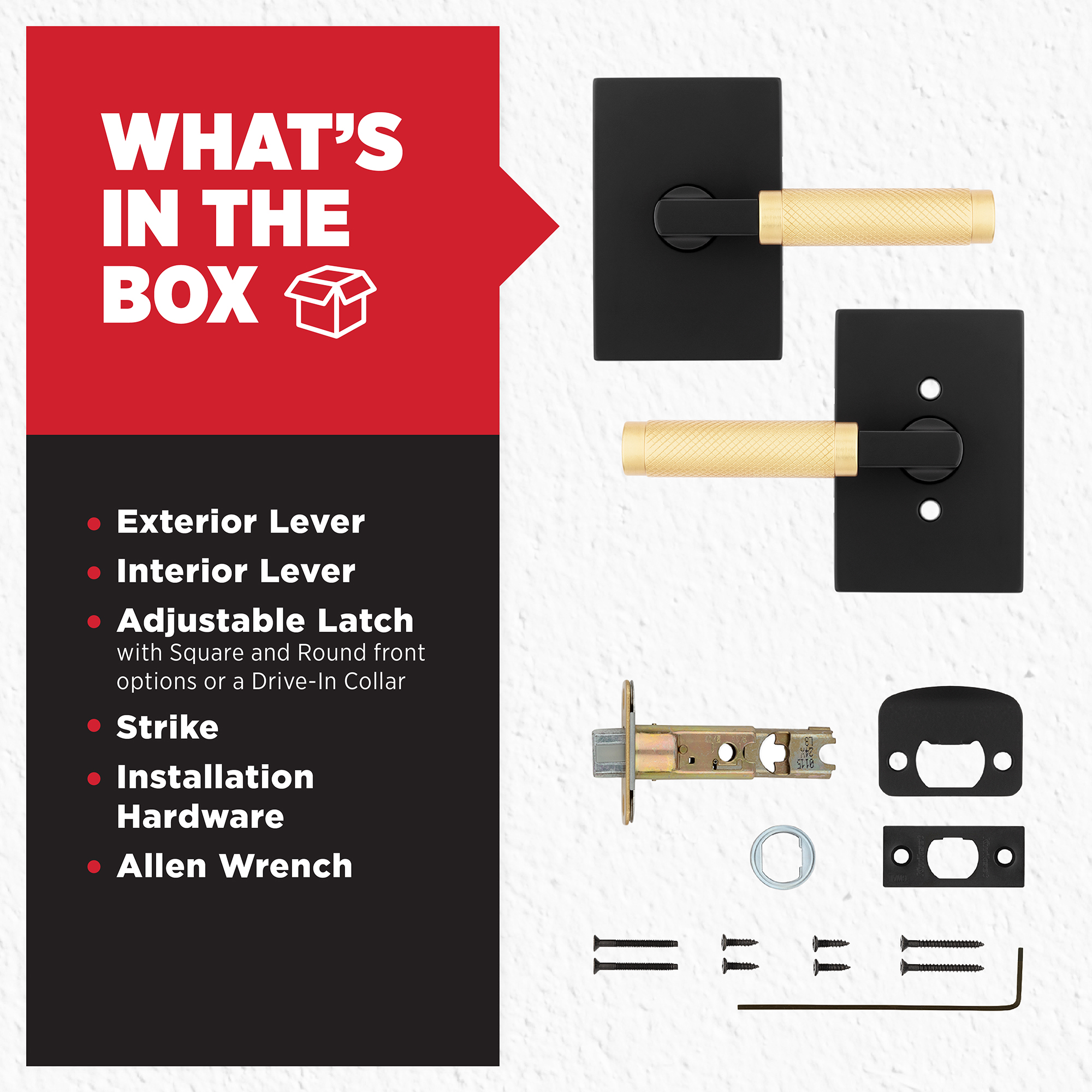 - Box Includes: Box Includes passage lever, Adjustable Latch with round and square front options or drive-in collar, round corner strike, designer rosette, screws and Allen wrench