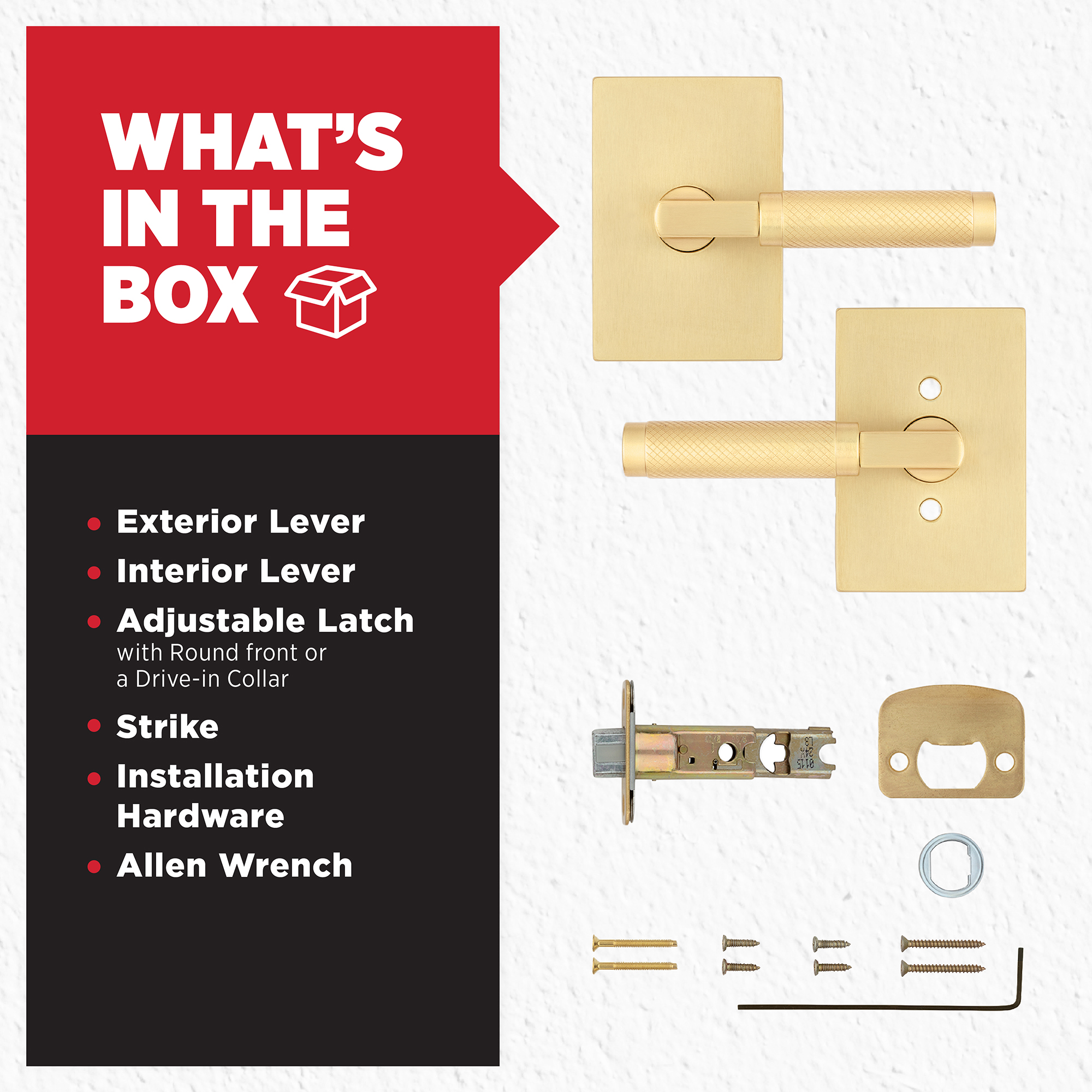 - Box Includes: Box includes passage lever, adjustable latch with round and square front options or drive-in collar, round corner strike, designer rosette, screws and Allen wrench