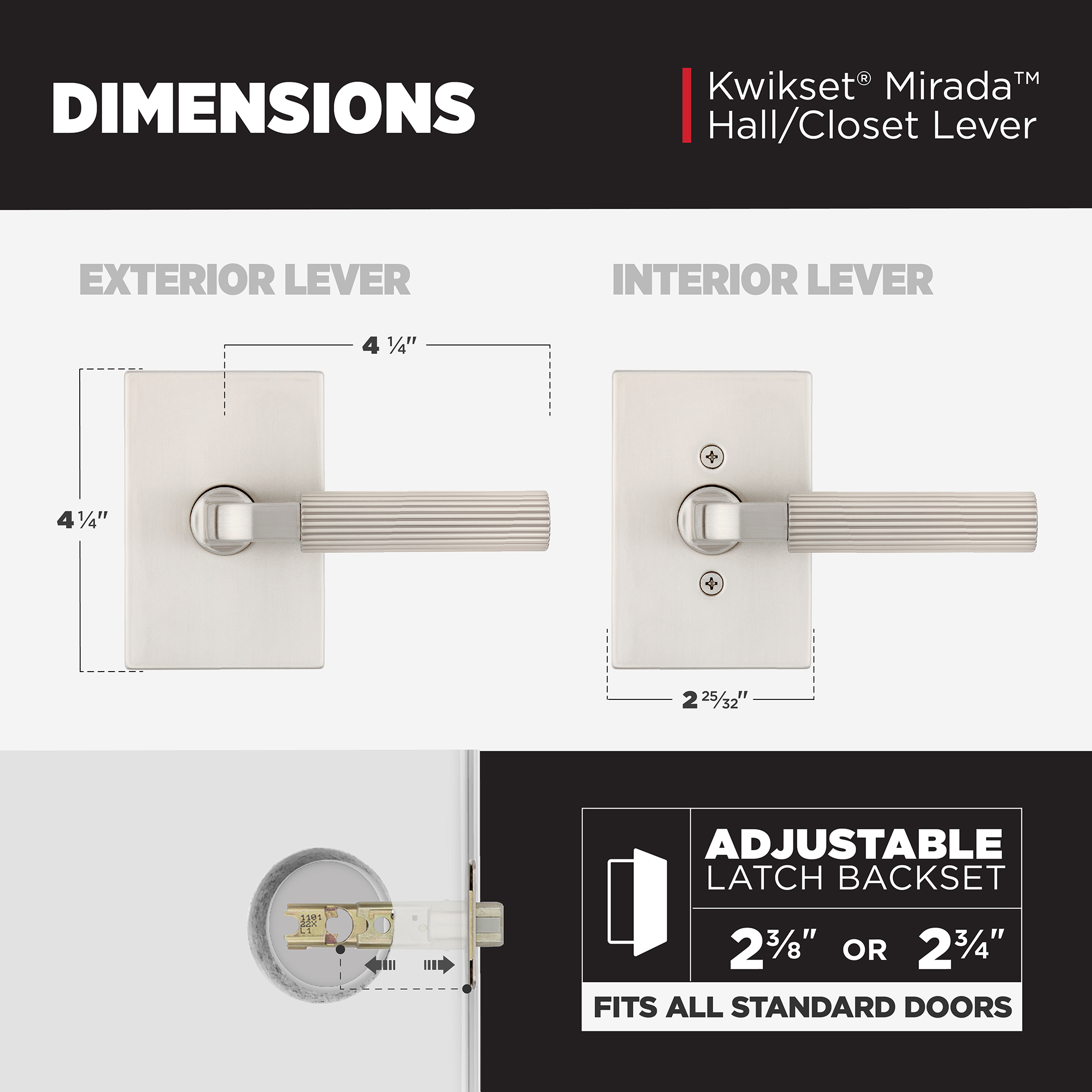 - Fits Standard Doors: Fits standard size doors 1-3/8" to 1-3/4" thick, latch backset adjusts to either 2-3/8" or 2-3/4" by sliding the adjustment pin during installation