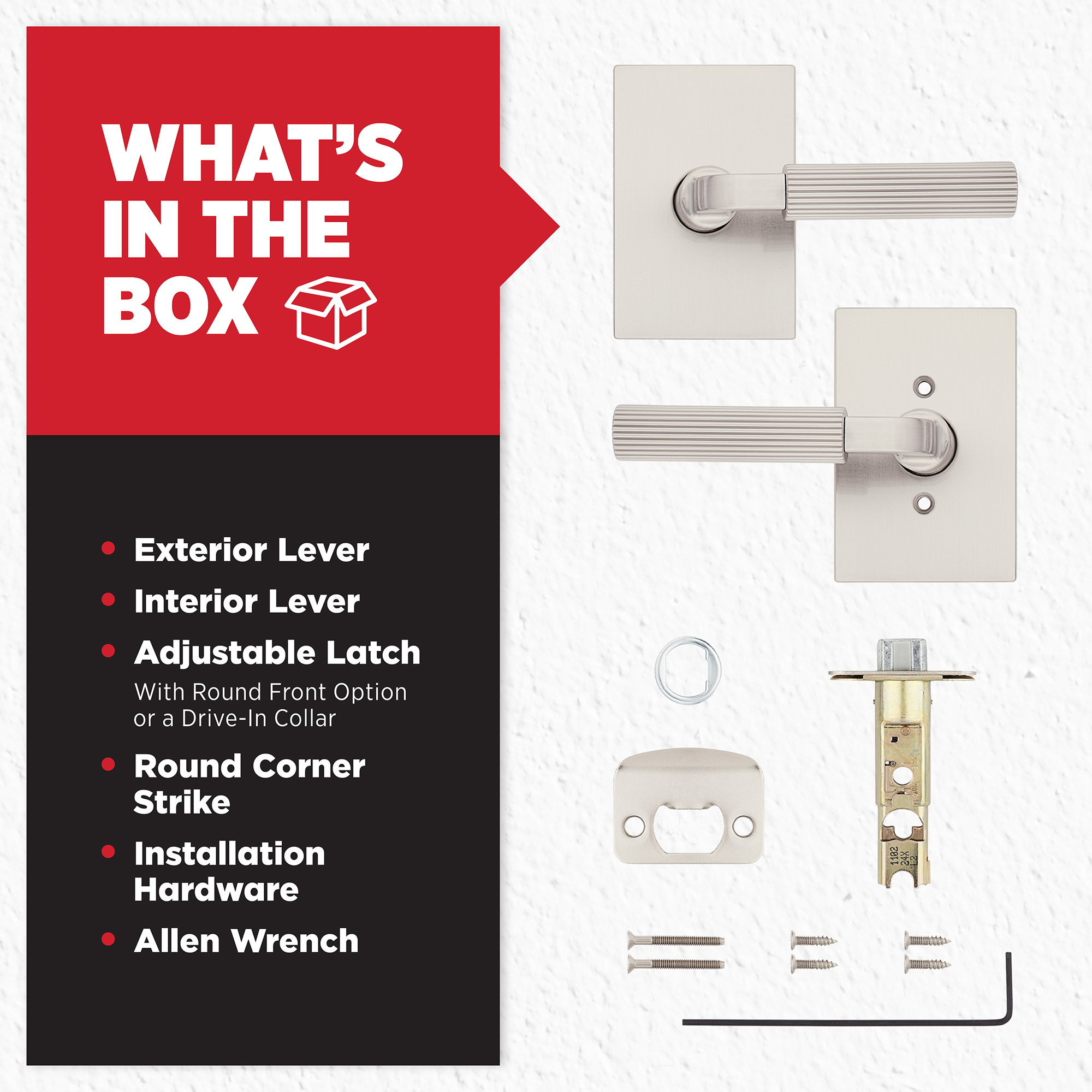 - Box Includes: Passage lever, Adjustable Latch with round front option or a drive-in collar, round corner strike, installation hardware and Allen wrench