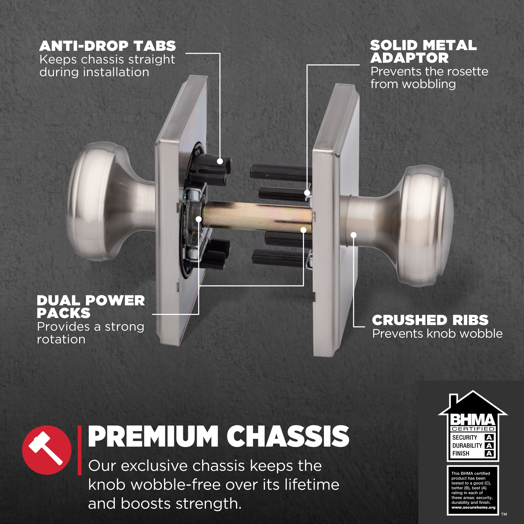 - Premium Chassis: Kwikset’s exclusive chassis uses dual compression springs, keeping theknob wobble-free over the lifetime of the product and enhancing its strength and rotationalfeel