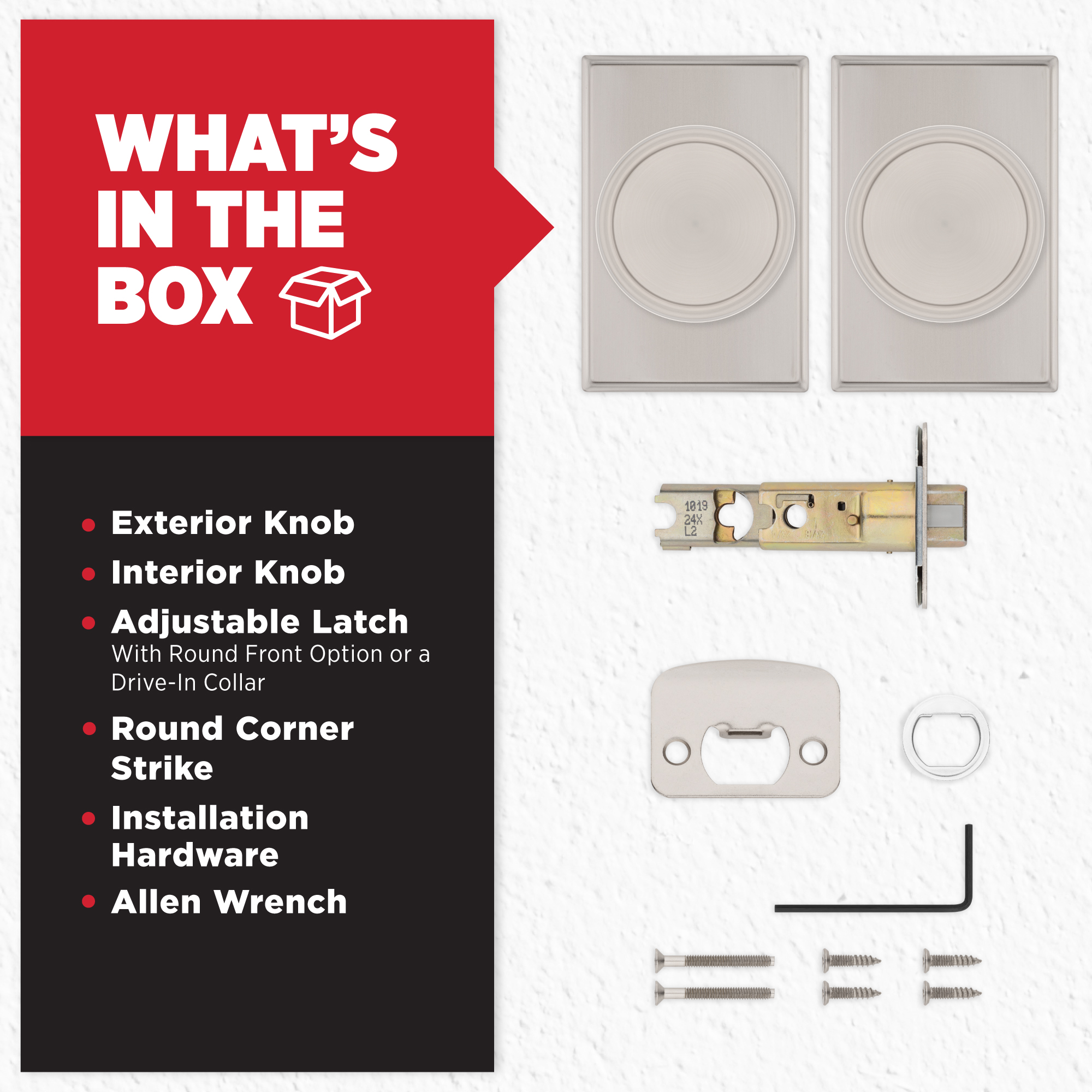 - Box Includes: Passage knob, Adjustable Latch with round front option or a drive-in collar,round corner strike, installation hardware and Allen wrench