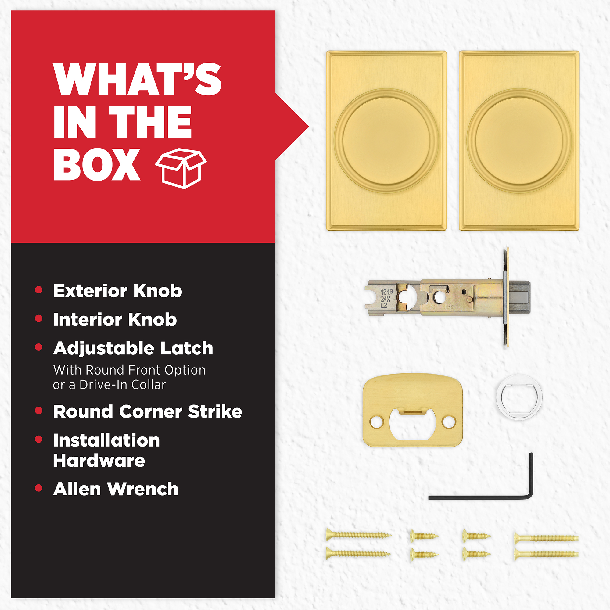 - Box Includes: Passage knob, Adjustable Latch with round front option or a drive-in collar,round corner strike, installation hardware and Allen wrench