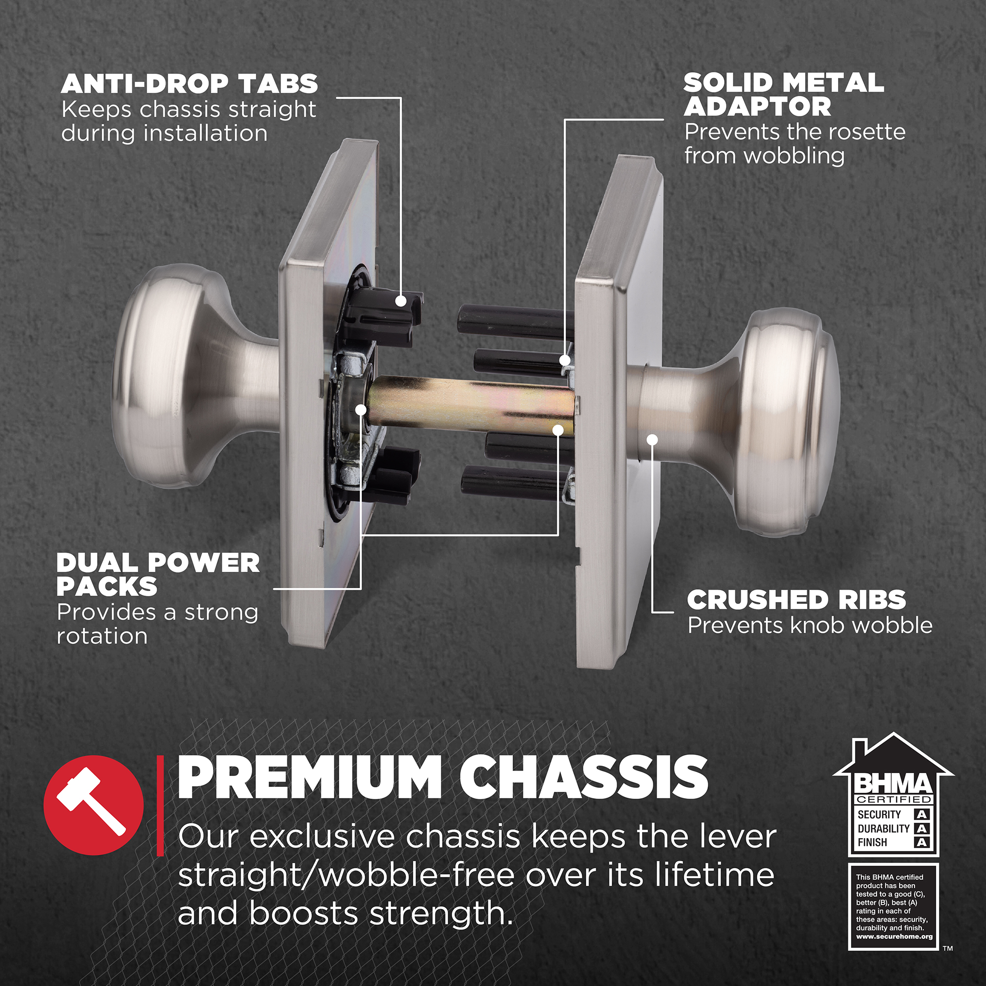 - Premium Chassis: Kwikset’s exclusive chassis uses dual compression springs, keeping theknob wobble-free over the lifetime of the product and enhancing its strength and rotationalfeel