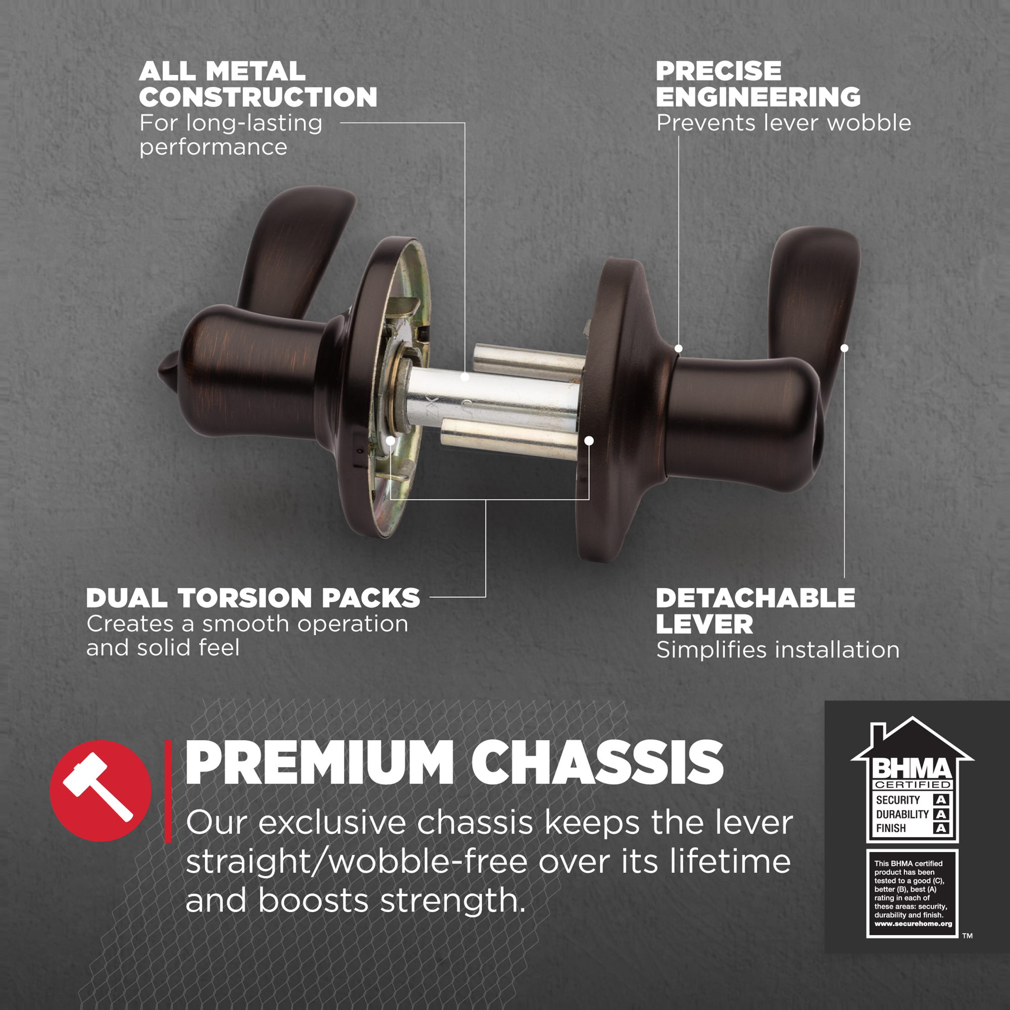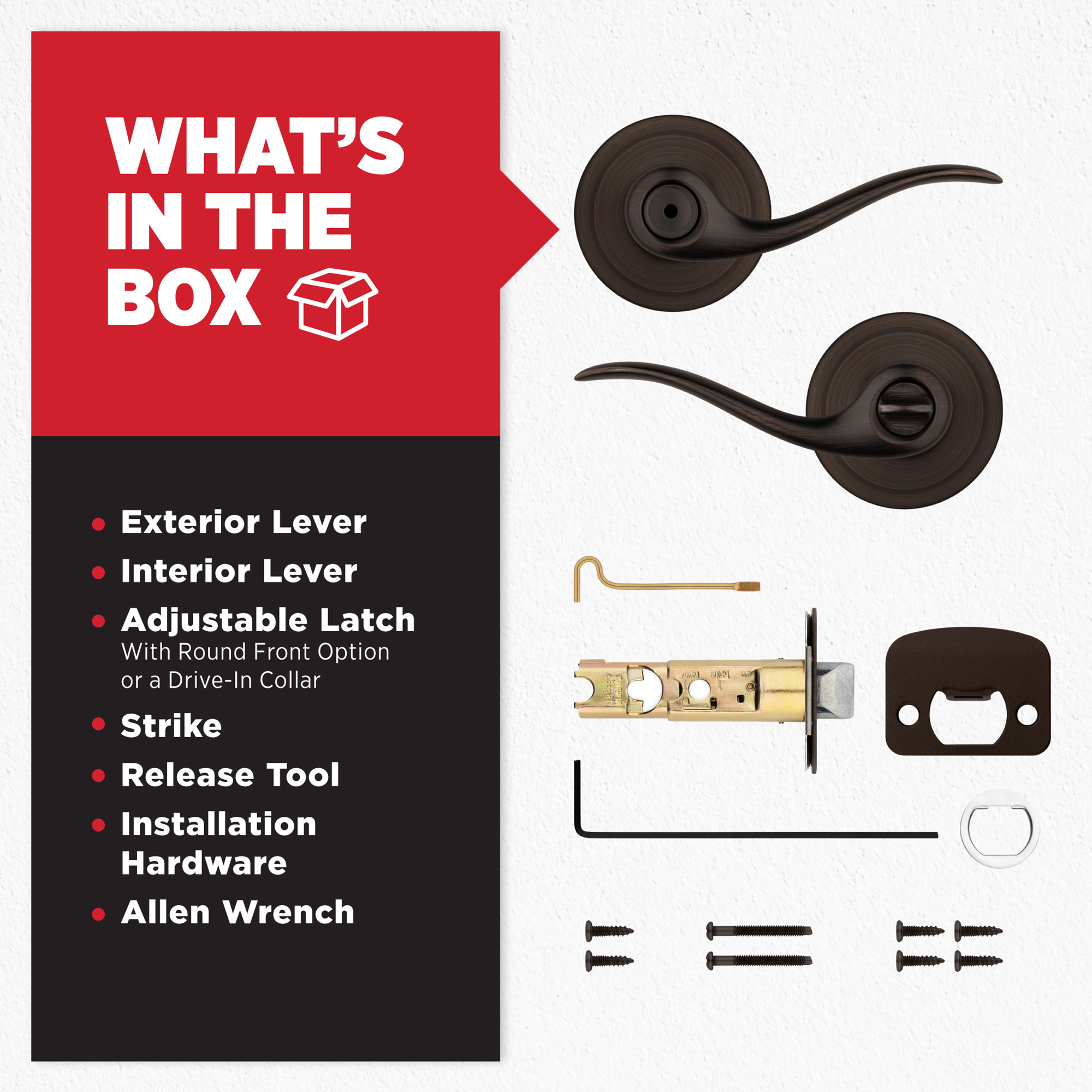 Box Includes: Box Includes privacy lever, Adjustable Latch with round and square front options or drive-in collar, round corner strike, designer rosette, screws and Allen wrench