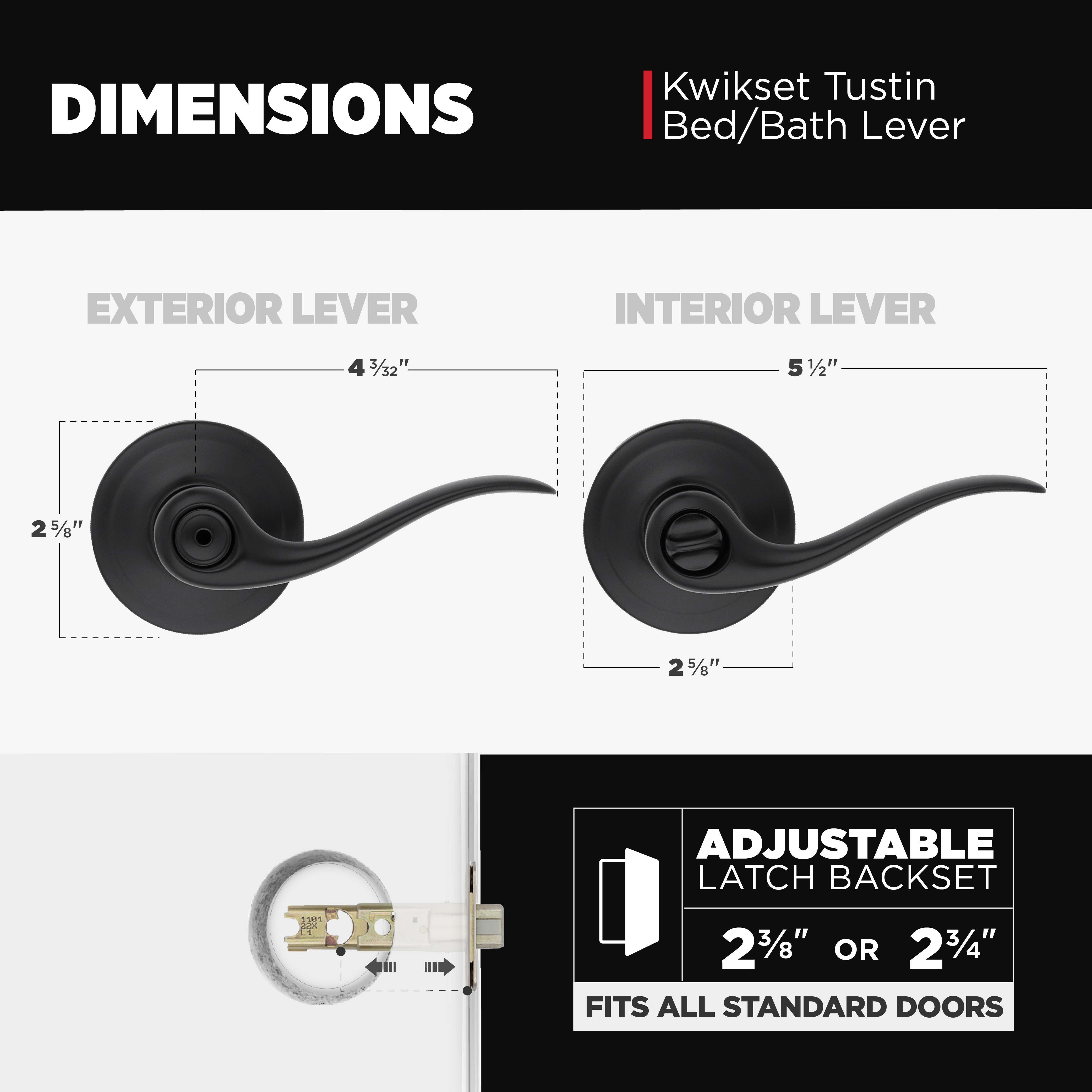 Fits Standard Doors: Fits standard size doors 1-3/8" to 1-3/4" thick, latch backset adjusts to either 2-3/8" or 2-3/4" by sliding the adjustment pin during installation