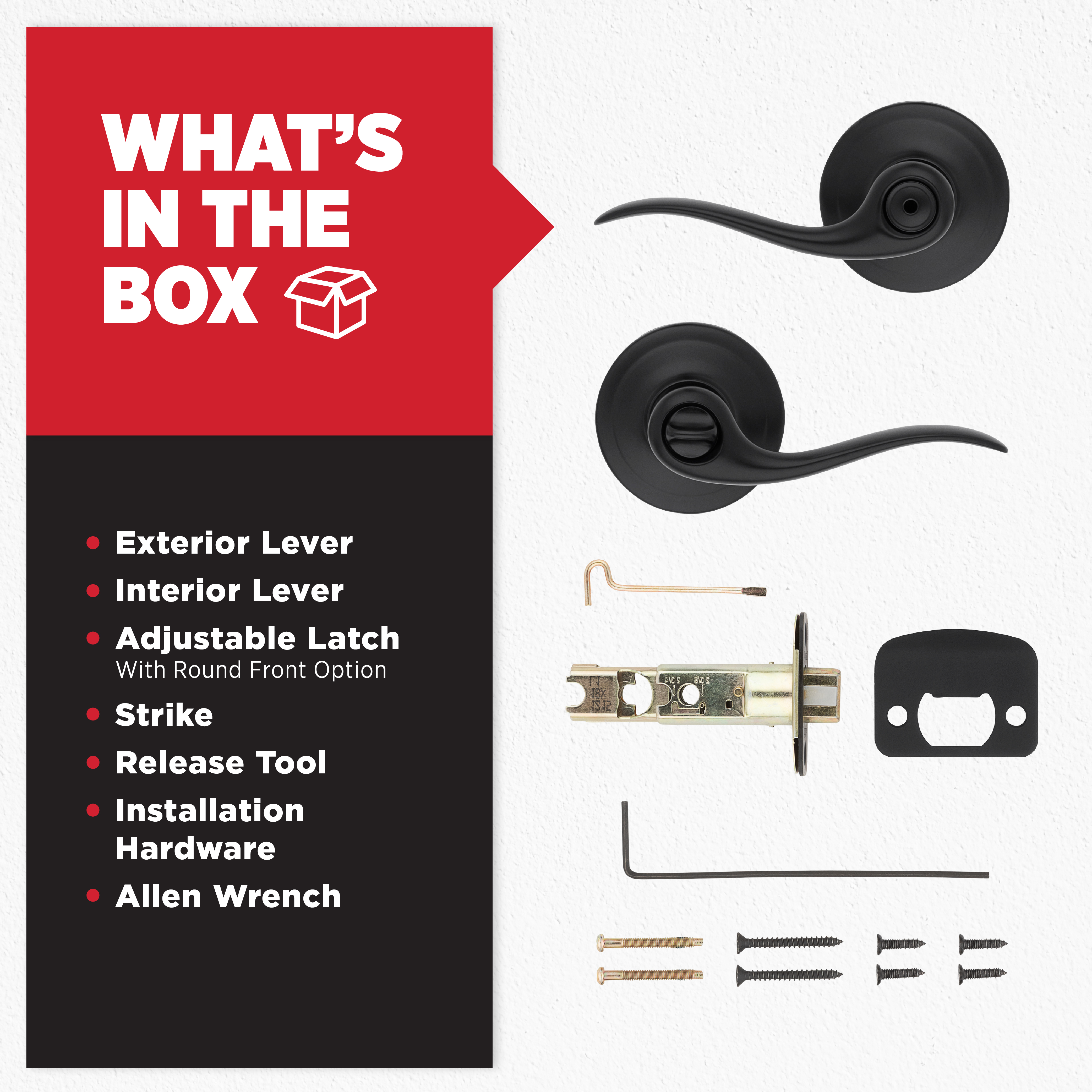 Box Includes: Box Includes privacy lever, Adjustable Latch with round and square front options or drive-in collar, round corner strike, designer rosette, screws and Allen wrench