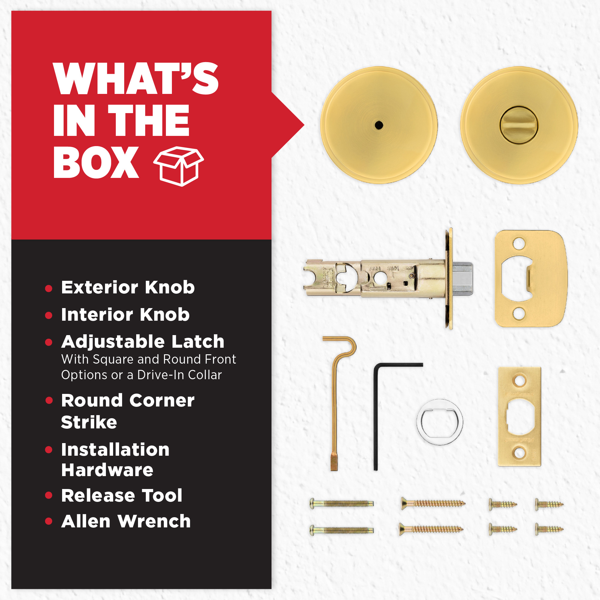 - Box Includes: Box Includes privacy knob, Adjustable Latch with round and square front options or drive-in collar, round corner strike, designer rosette, screws and Allen wrench