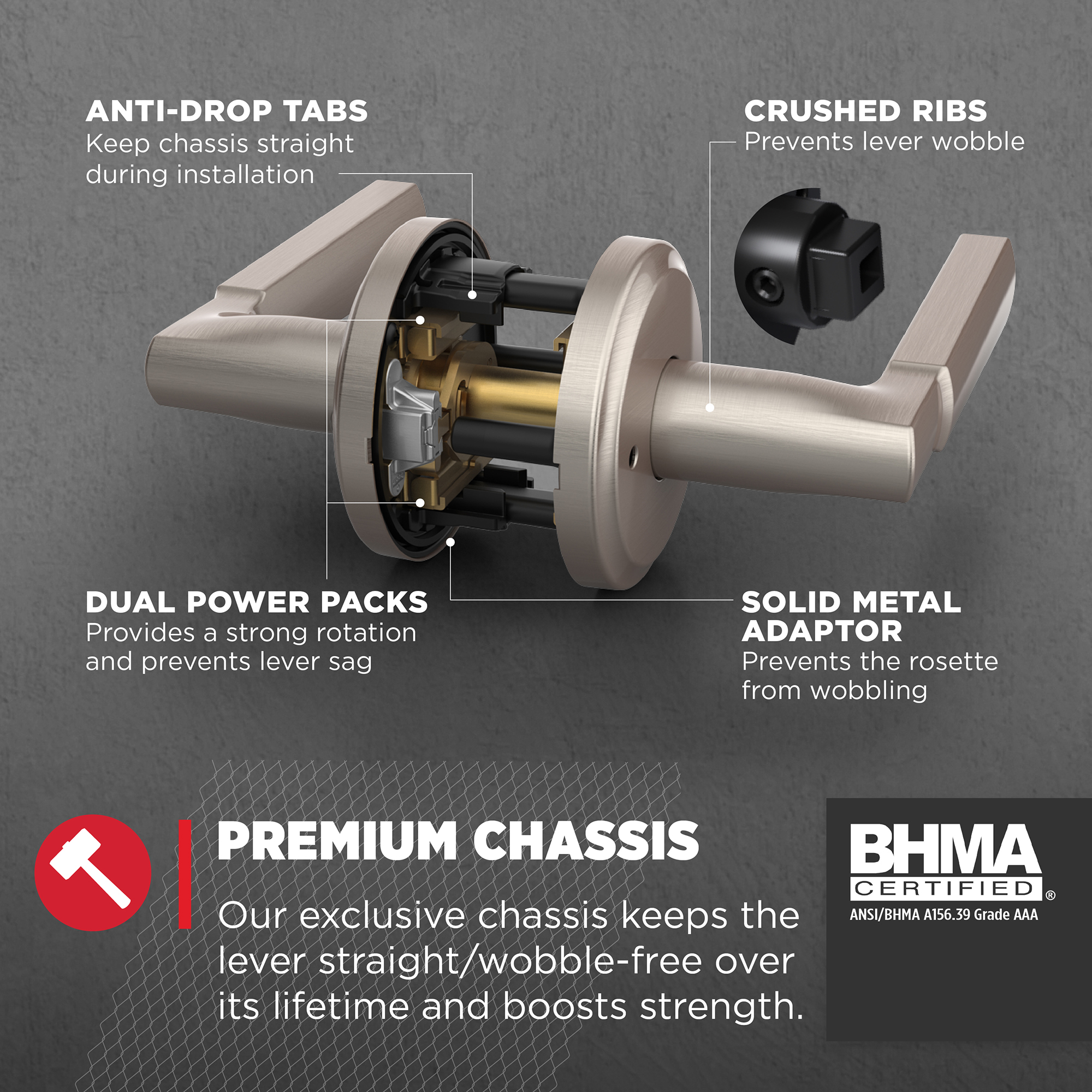 - Adjustable Latch: By sliding the adjustment pin during installation, the latch backset can be adjusted to either 2-3/8" or 2-3/4" in order to fit all standard door preparations