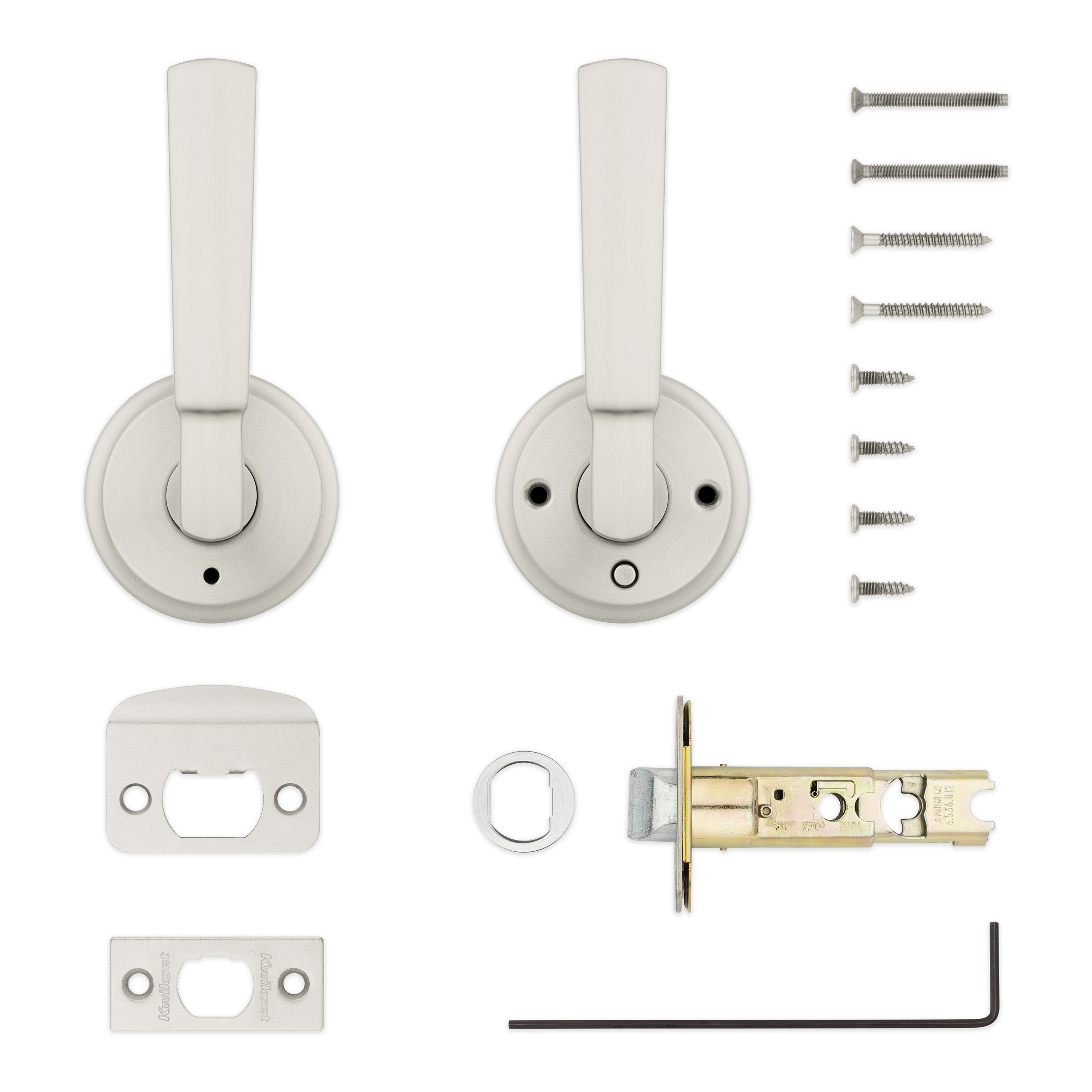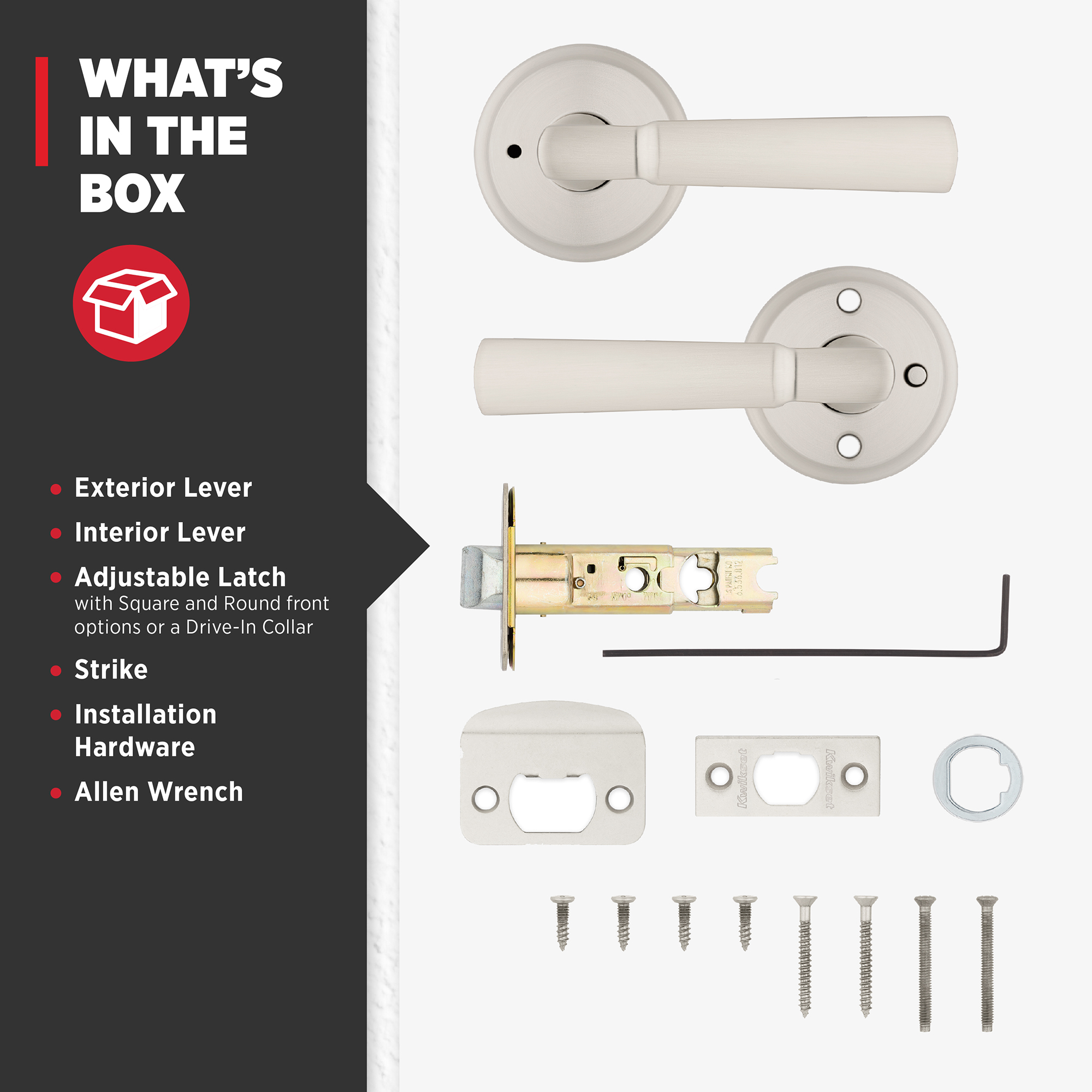 - Box Includes: Box Includes privacy lever, Adjustable Latch with round and square front options or drive-in collar, round corner strike, designer rosette, screws and Allen wrench