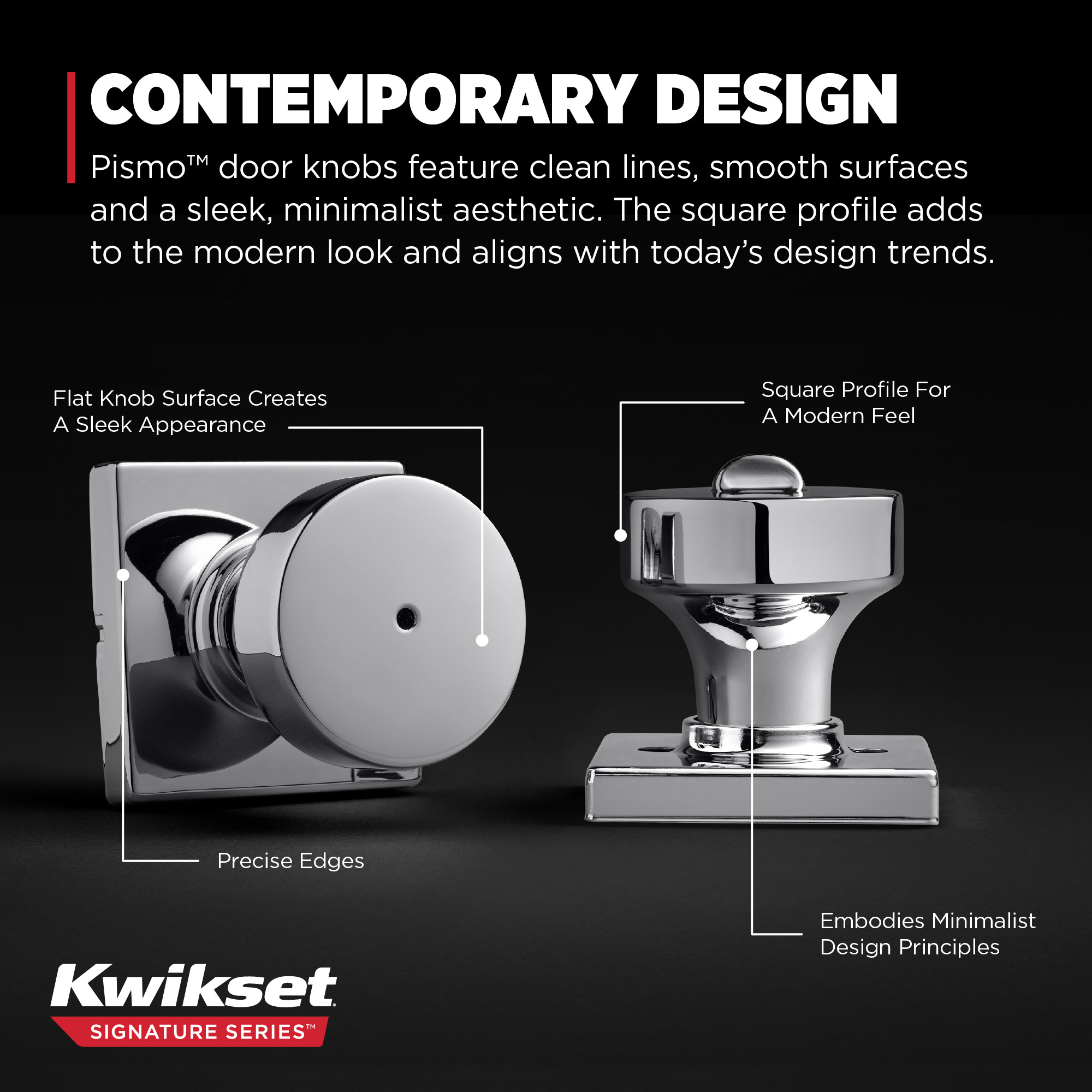 | Product Description | When it comes to contemporary design, Pismo™ door knobs hit the mark with clean lines, smooth surfaces and a sleek, minimalist aesthetic. The square profile adds to the modern look and aligns with today’s design trends. Elevate your space with Pismo™ and turn every door into a chic style statement. |
