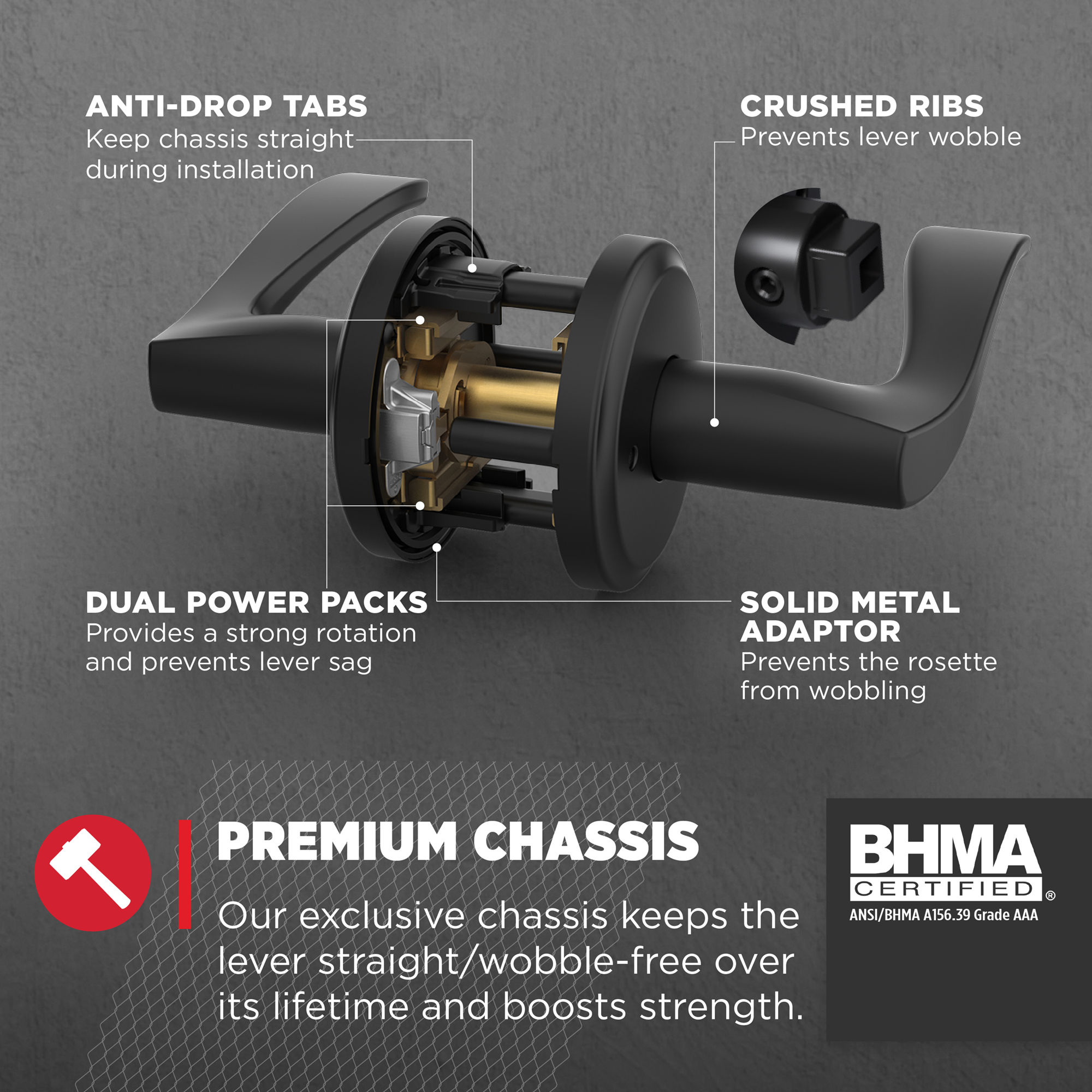 - Adjustable Latch: By sliding the adjustment pin during installation, the latch backset can be adjusted to either 2-3/8" or 2-3/4" in order to fit all standard door preparations