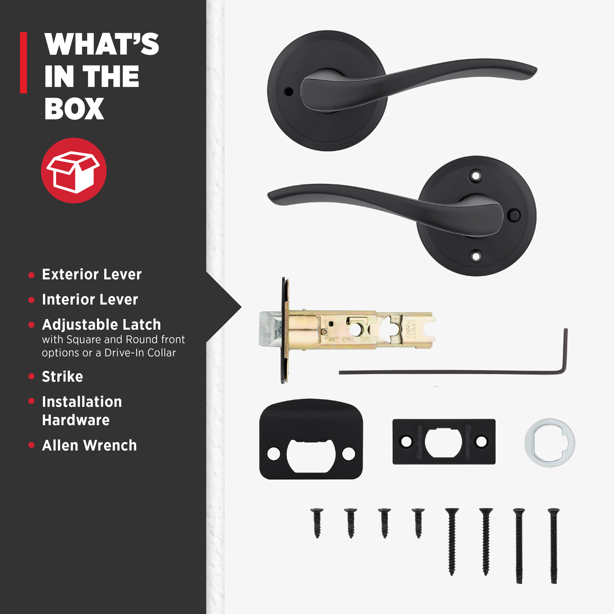 - Box Includes: Box Includes privacy lever, Adjustable Latch with round and square front options or drive-in collar, round corner strike, designer rosette, screws and Allen wrench