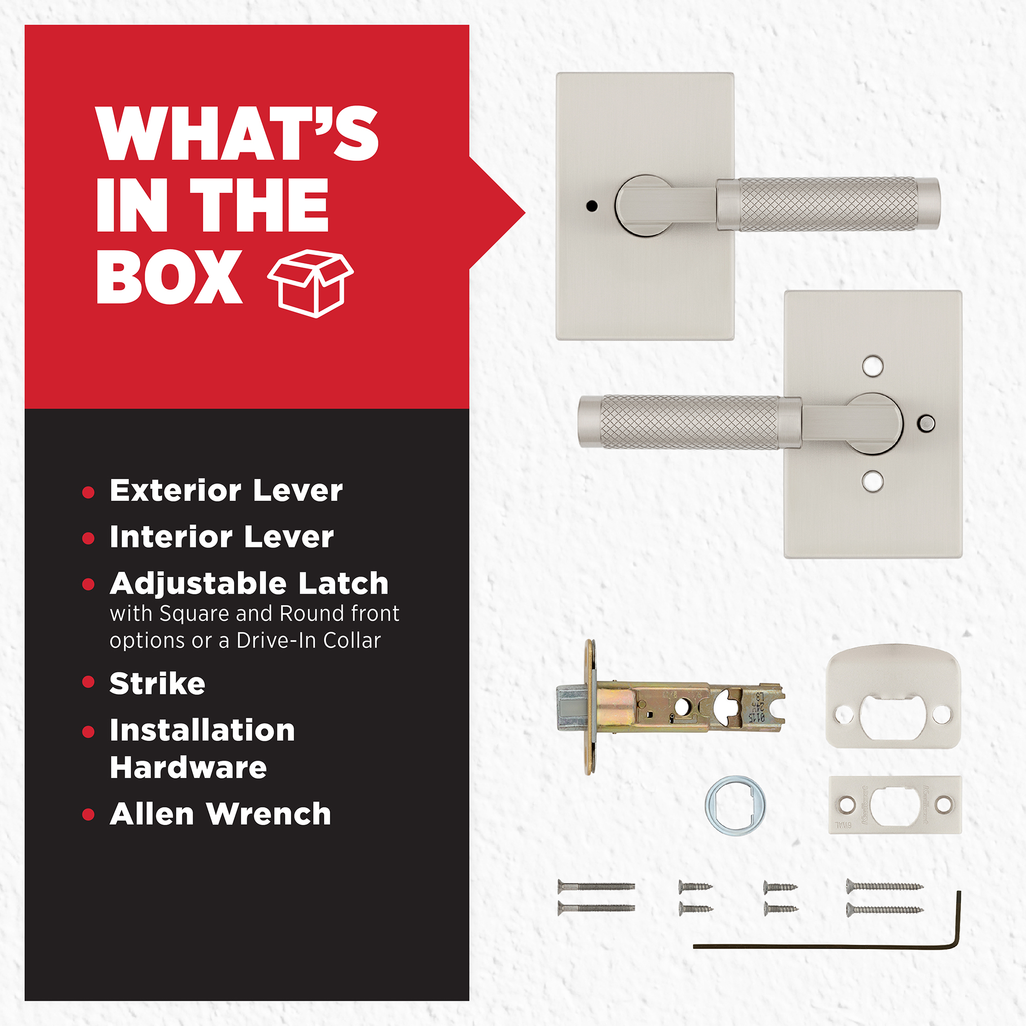 - Box Includes: Box Includes privacy lever, Adjustable Latch with round and square front options or drive-in collar, round corner strike, designer rosette, screws and Allen wrench