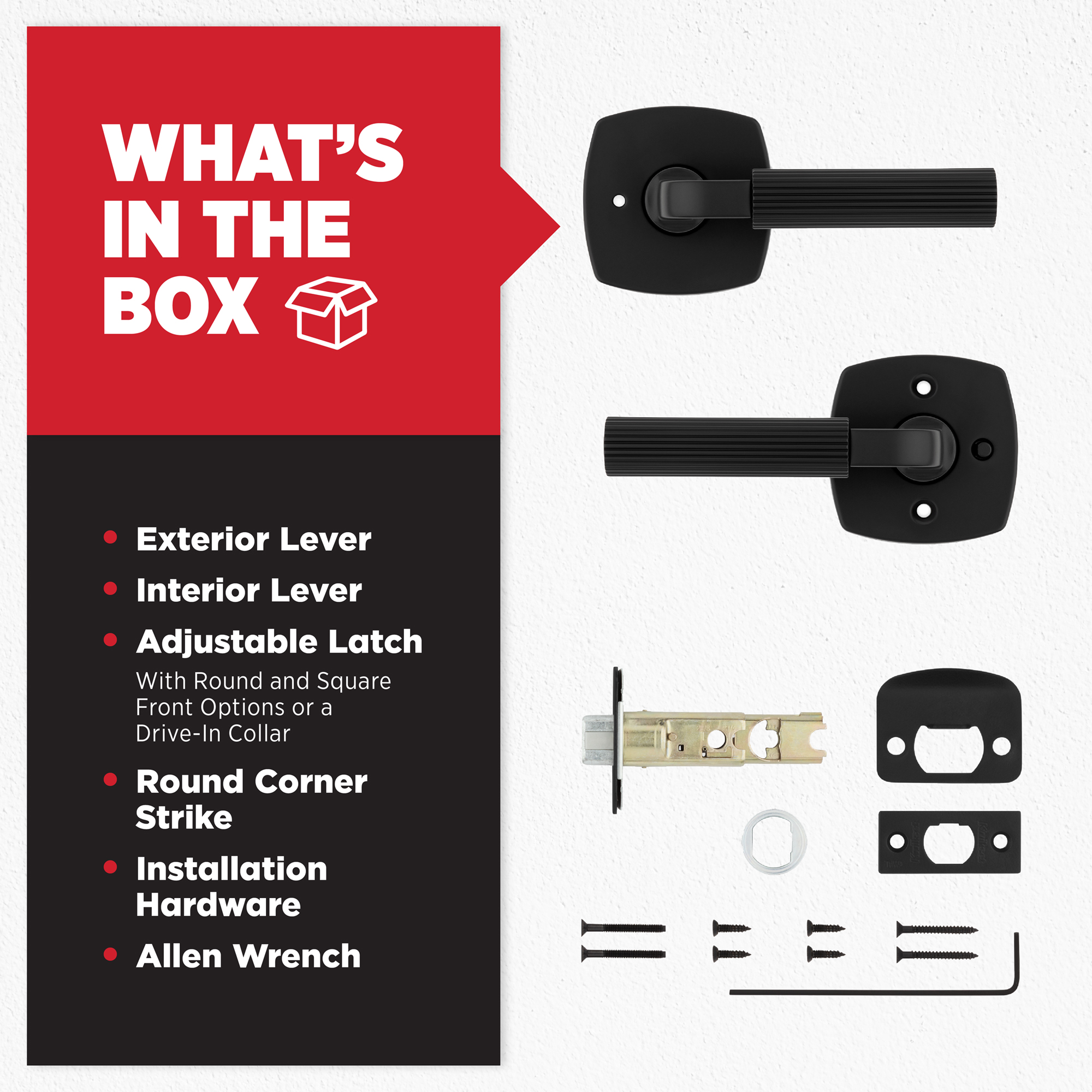 - Box Includes: Privacy lever, adjustable latch with round and square front options or a drive-in collar, round corner strike, installation hardware and Allen wrench