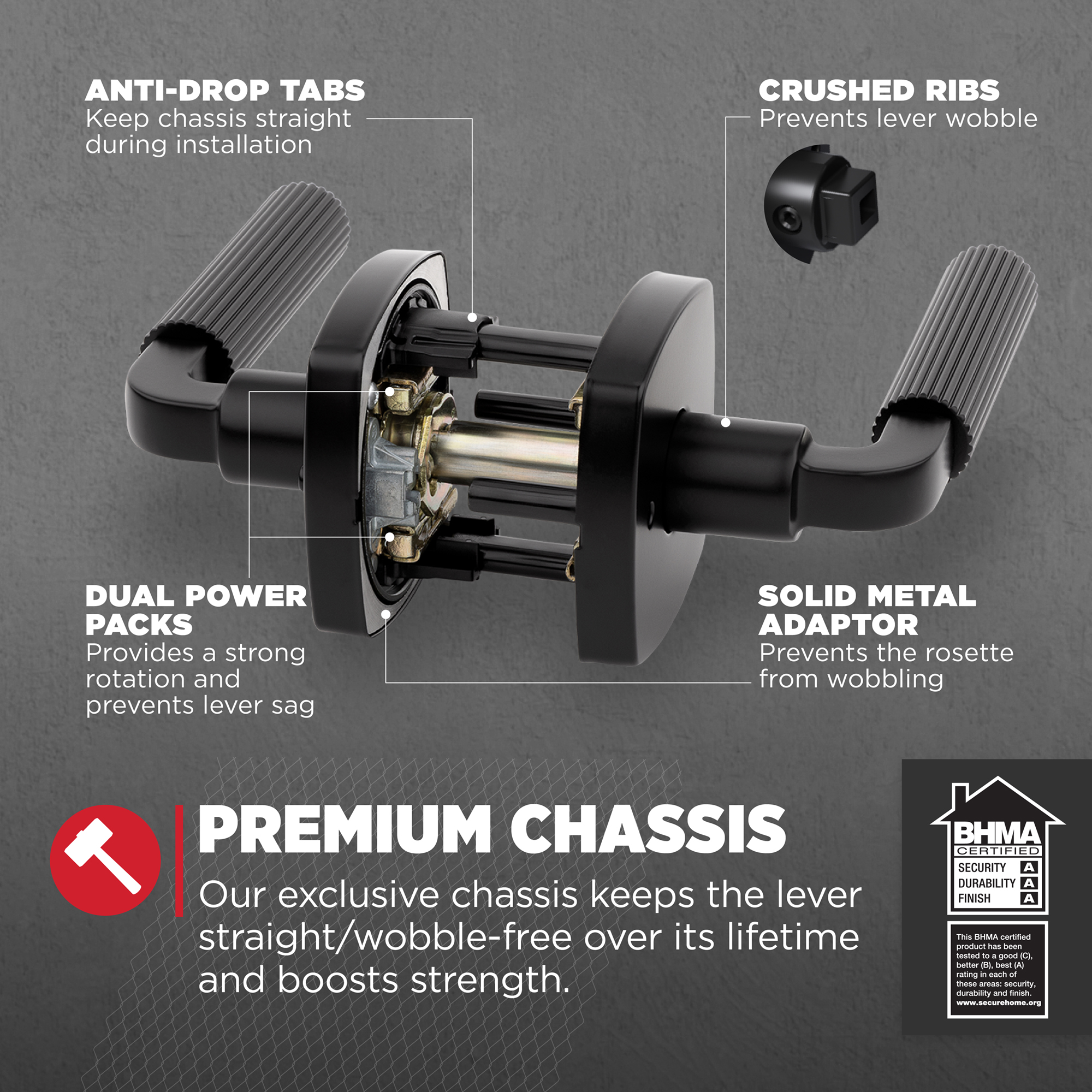 - Premium Chassis: Kwikset’s exclusive chassis uses dual compression springs, keeping the lever straight and wobble-free over the lifetime of the product and enhancing its strength and rotational feel
