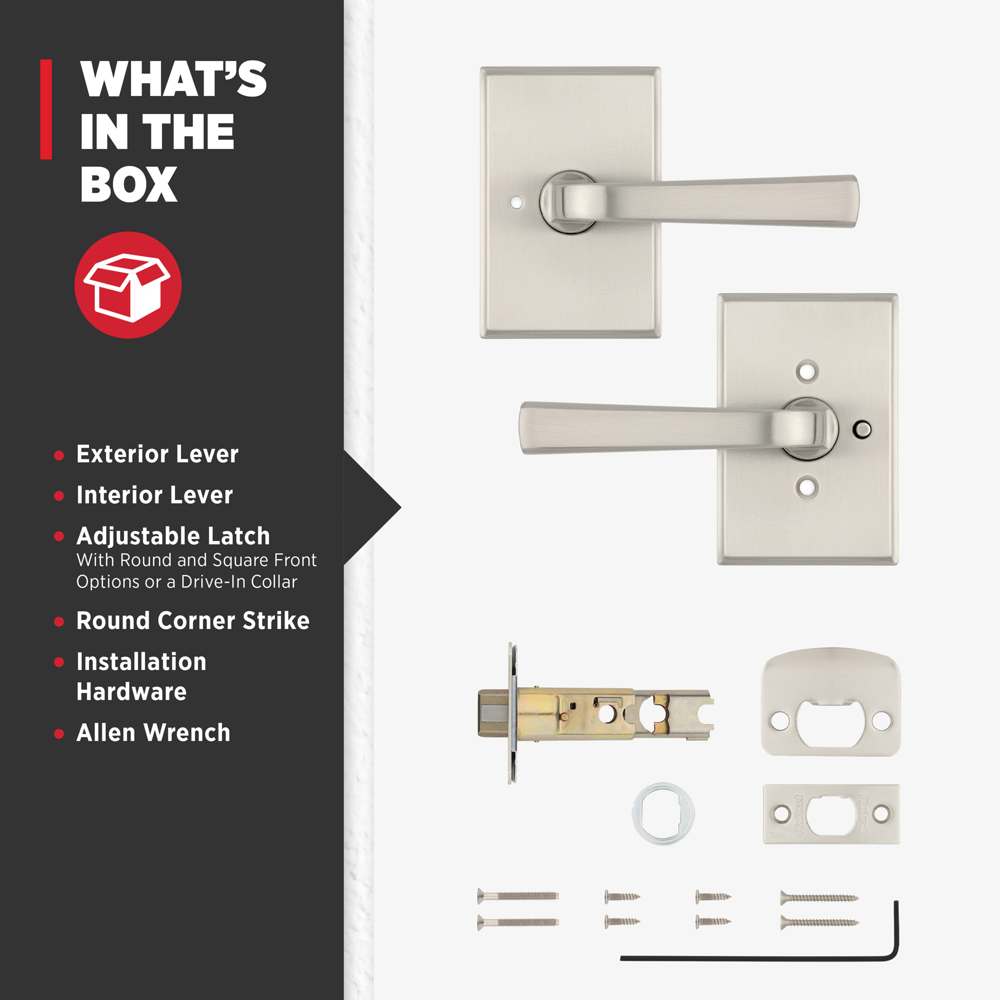 - Box Includes: Privacy lever, adjustable latch with round and square front options or a drive-in collar, round corner strike, installation hardware and Allen wrench