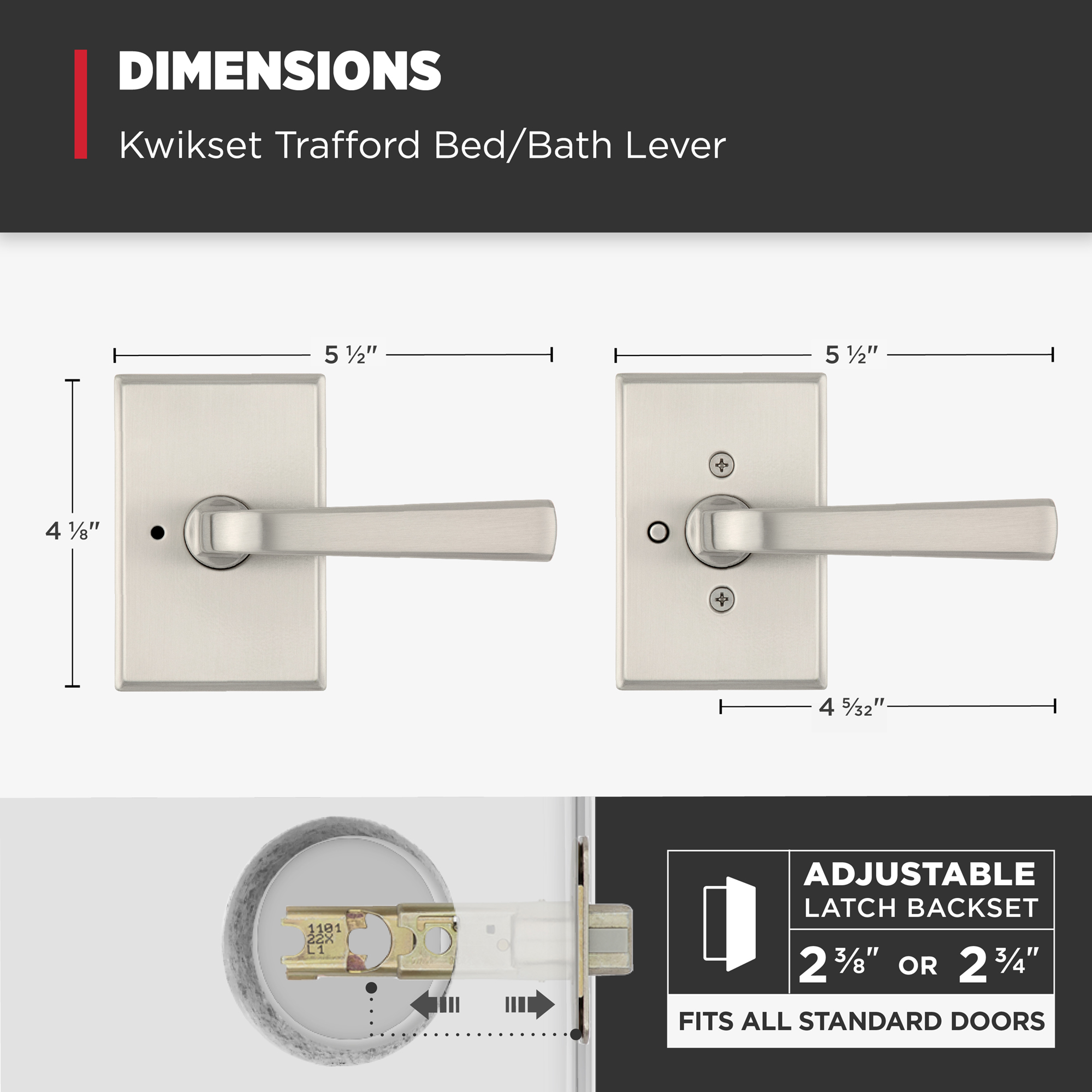 - Fits Standard Doors: Fits standard size doors 1-3/8" to 1-3/4" thick, latch backset adjusts to either 2-3/8" or 2-3/4" by sliding the adjustment pin during installation