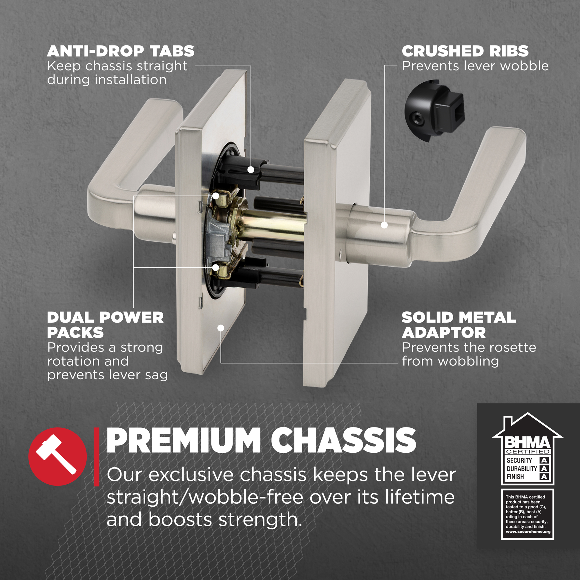- Premium Chassis: Kwikset’s exclusive chassis uses dual compression springs, keeping the lever straight and wobble-free over the lifetime of the product and enhancing its strength and rotational feel