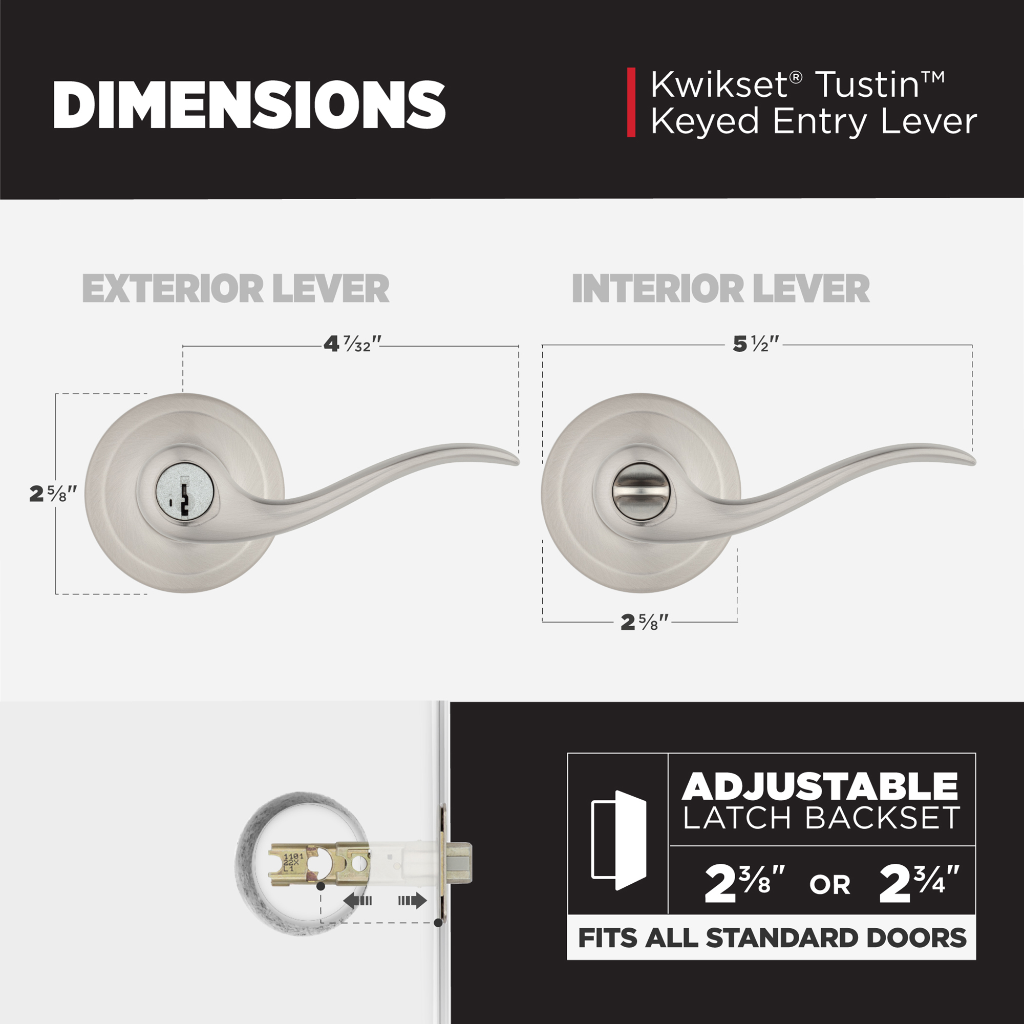 Fits Standard Doors: Fits standard size doors 1-3/8" to 1-3/4" thick, latch backset adjusts to either 2-3/8" or 2-3/4" by sliding the adjustment pin during installation