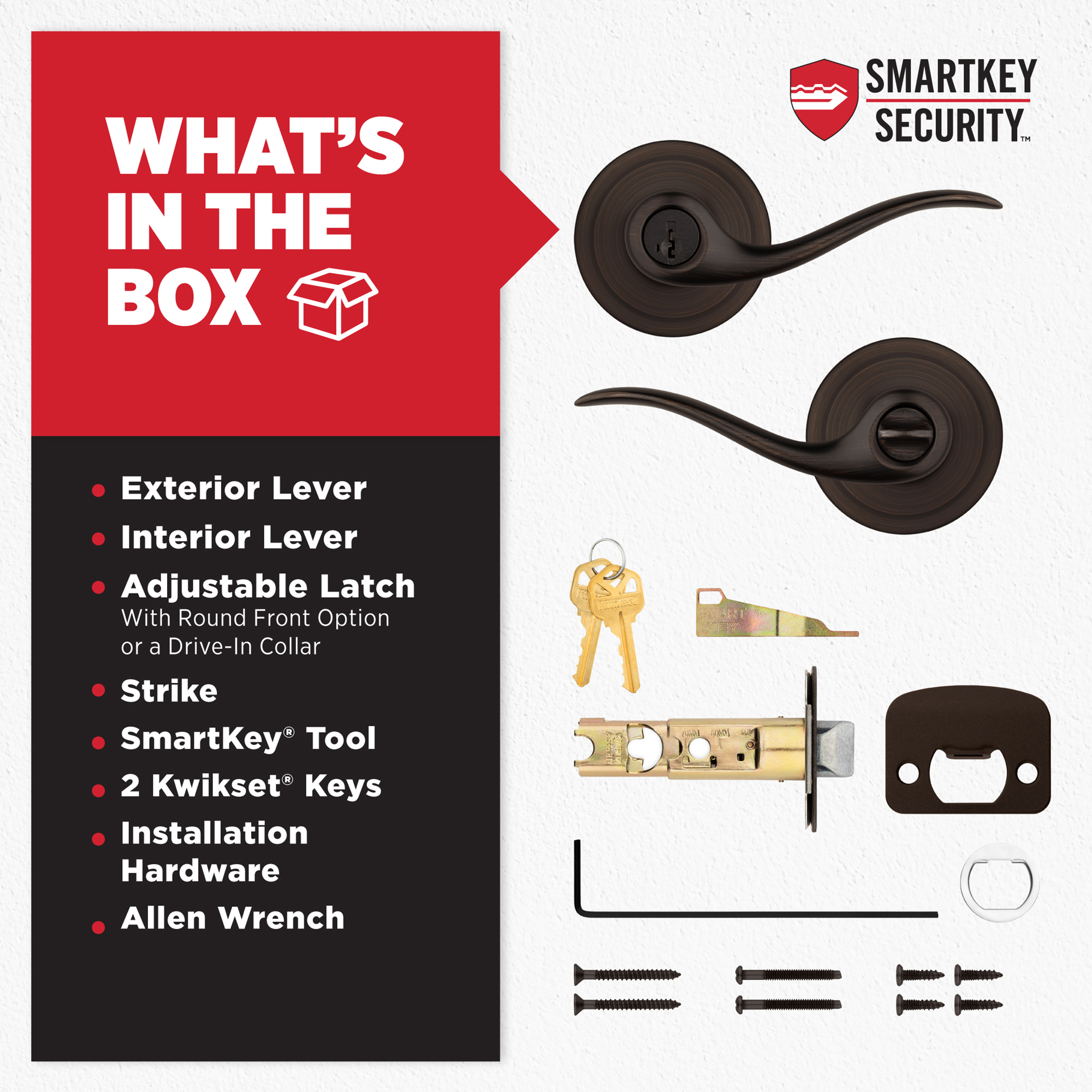 SmartKey Security™ re-key technology is compatible with Kwikset (KW1) keyway or (SC1) keyway options