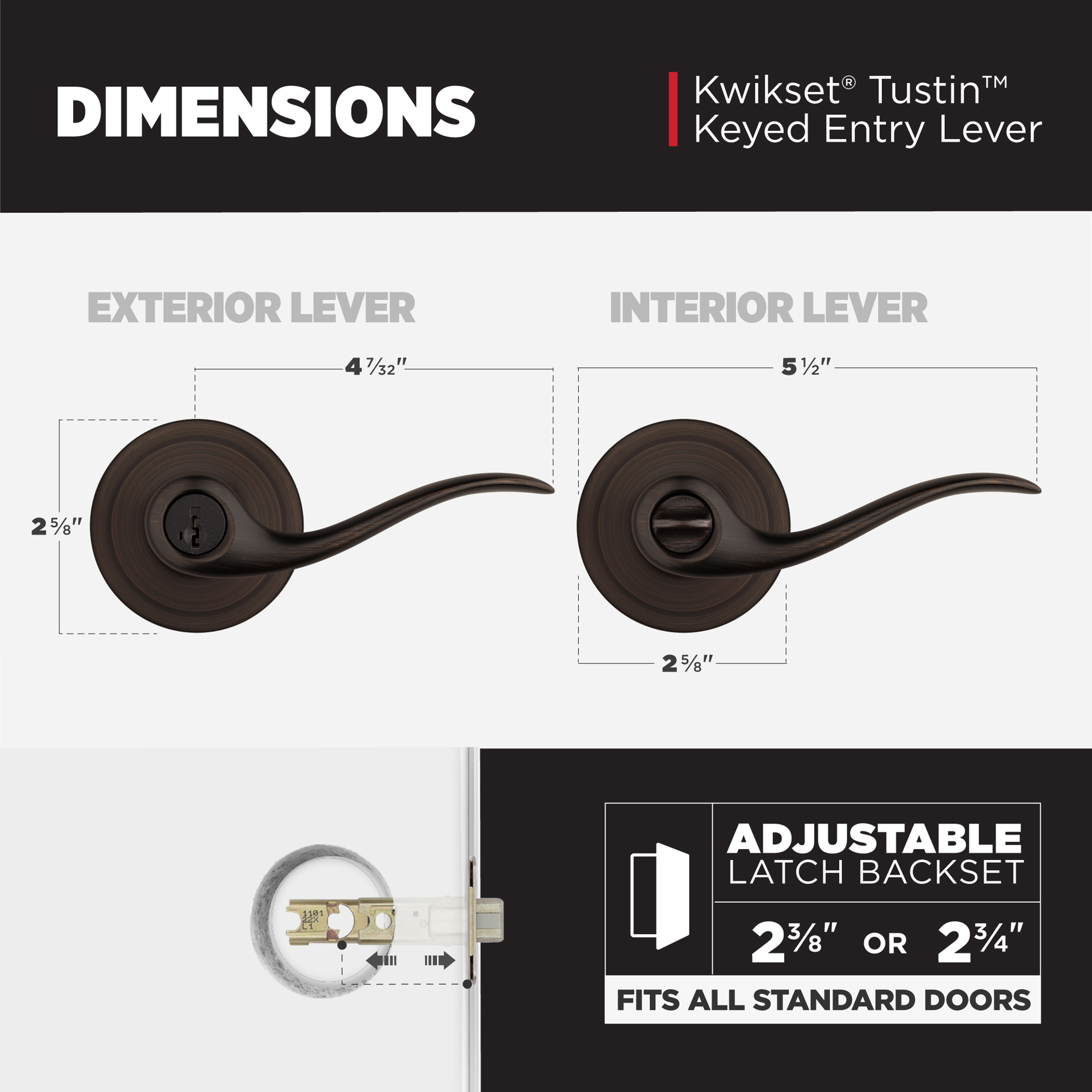 Fits Standard Doors: Fits standard size doors 1-3/8" to 1-3/4" thick, latch backset adjusts to either 2-3/8" or 2-3/4" by sliding the adjustment pin during installation