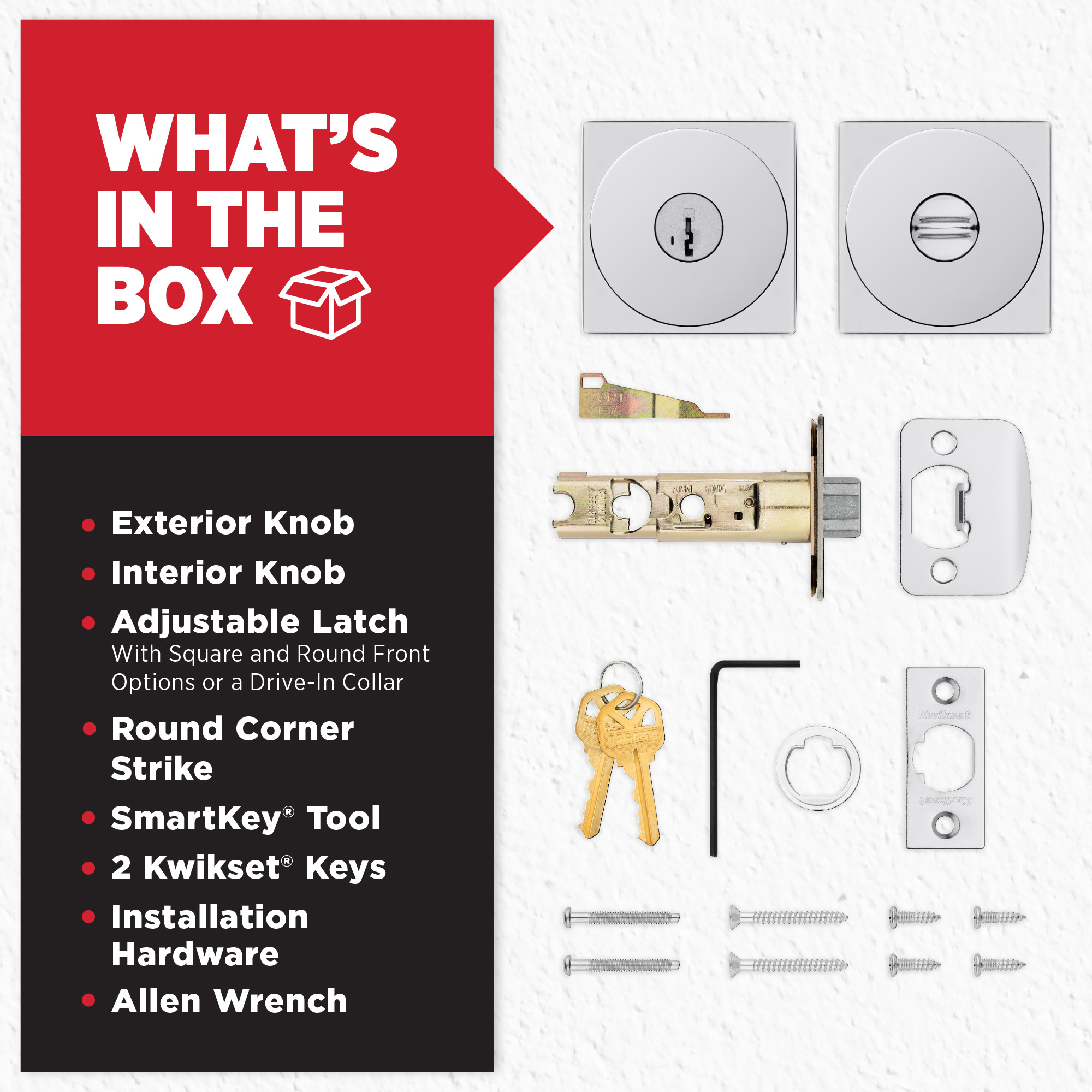SmartKey Security™ re-key technology is compatible with Kwikset (KW1) keyway or (SC1) keyway options