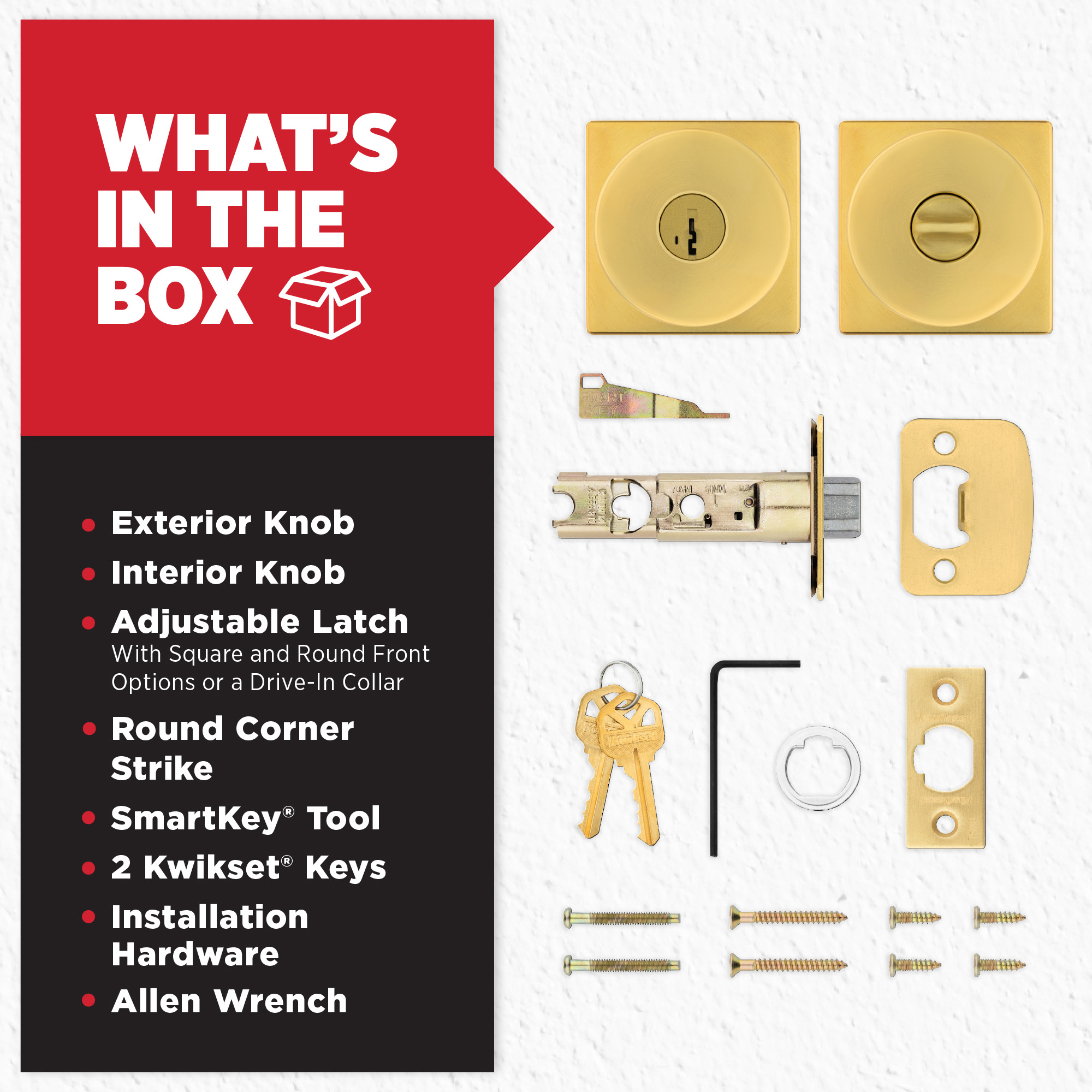 - Box Includes: Box Includes entry knobs, Adjustable Latch with round and square front options or drive-in collar, round corner strike, SmartKey tool, 2 Kwikset keys, designer rosette, screws and Allen wrench