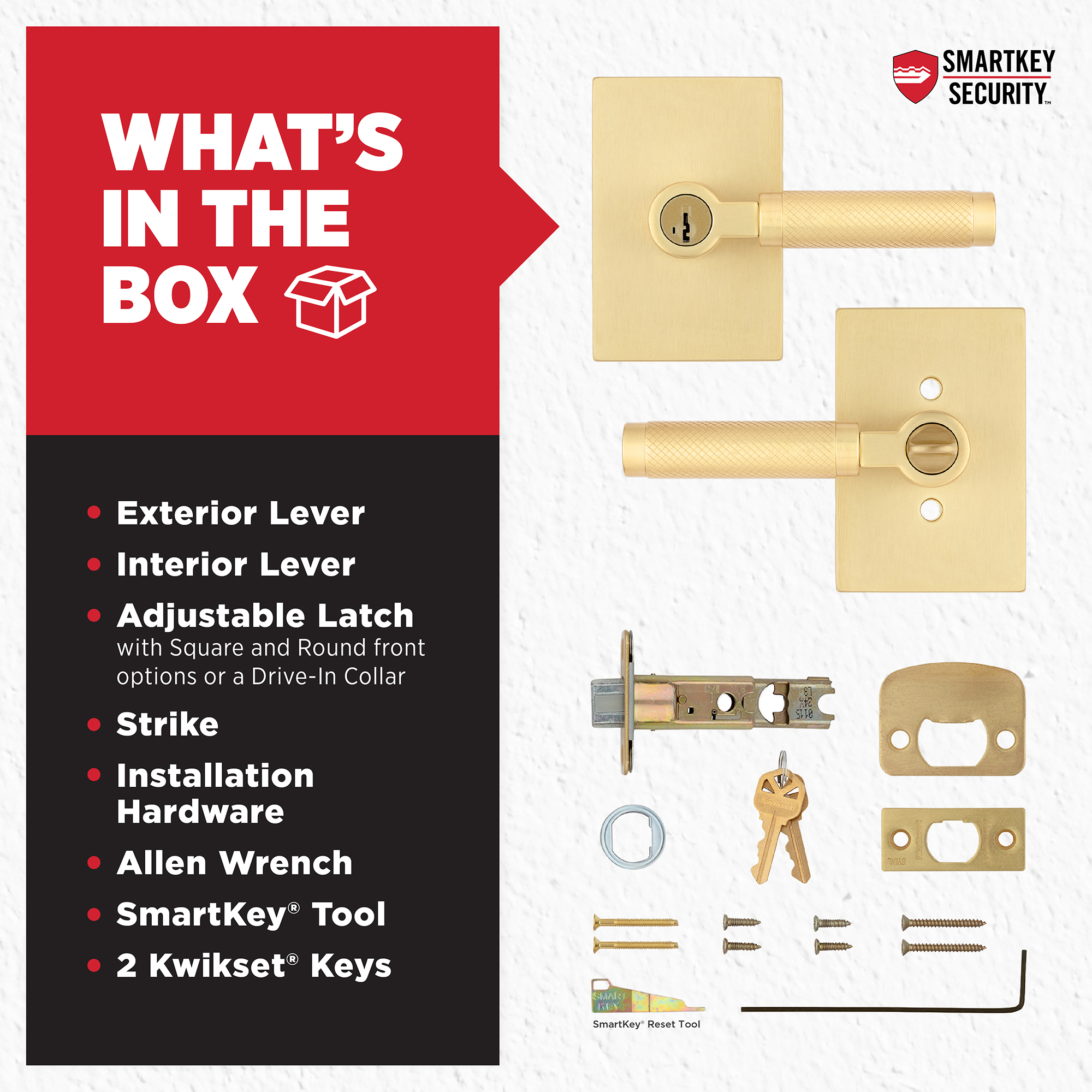 Step up to designer styles and superior security with Kwikset Signature Series products. Prava merges alluring aesthetics and trusted functionality. With intricate, decorative knurling, you can feel the Kwikset difference on each statement piece. Experience tactile luxury, contemporary style and elevated craftsmanship on every door. Both levers/knobs can be operated by a key on the outside or thumb turn on the inside. The textured finish of Satin Brass gives it a refined, rustic look.