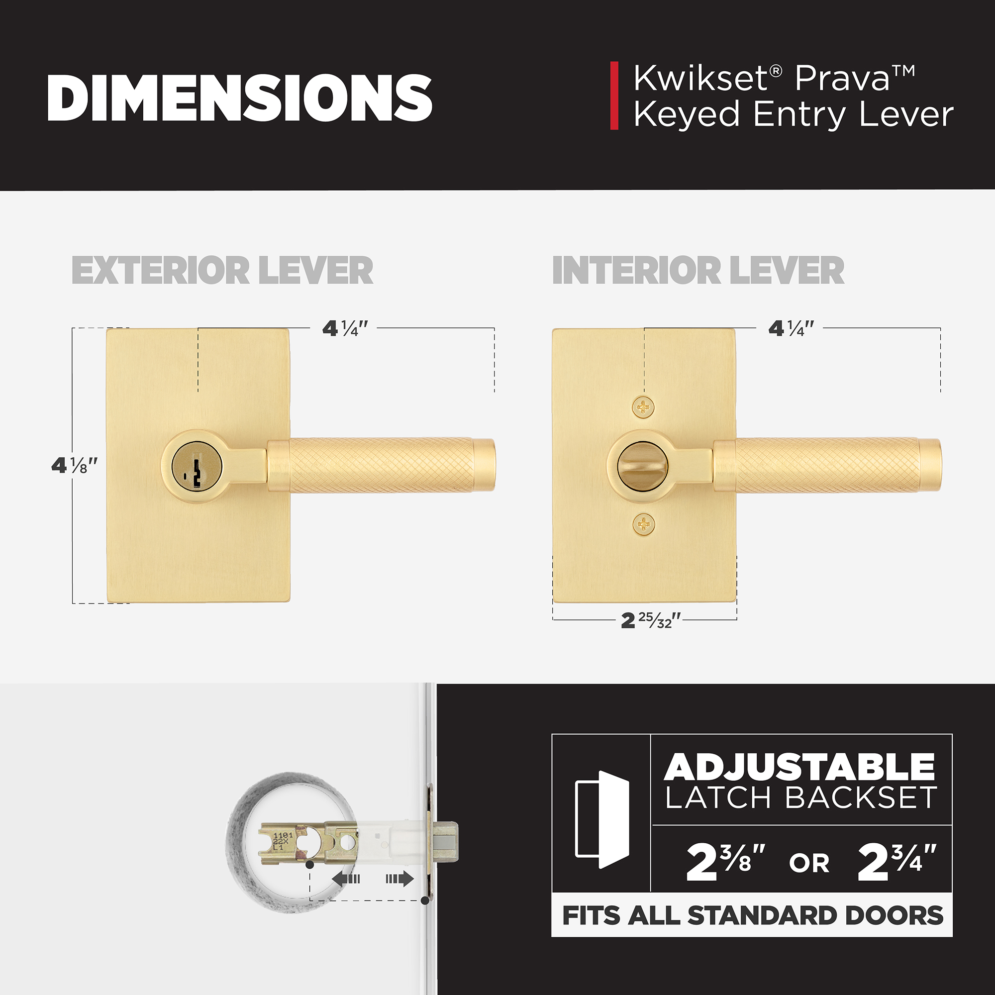 Latch has adjustable backset 2-3/8" to 2-3/4" to fit all standard door preparations