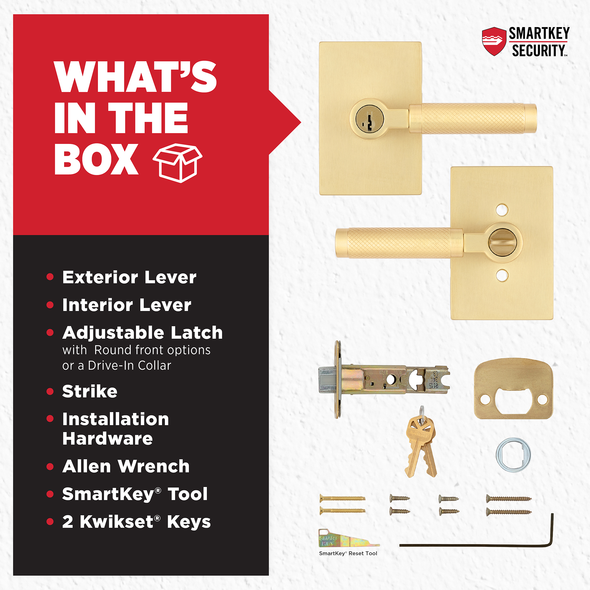 Box Includes: Box includes entry levers, adjustable latch with round and square front options or drive-in collar, round corner strike, SmartKey® tool, 2 Kwikset® keys, designer rosette, screws and Allen wrench