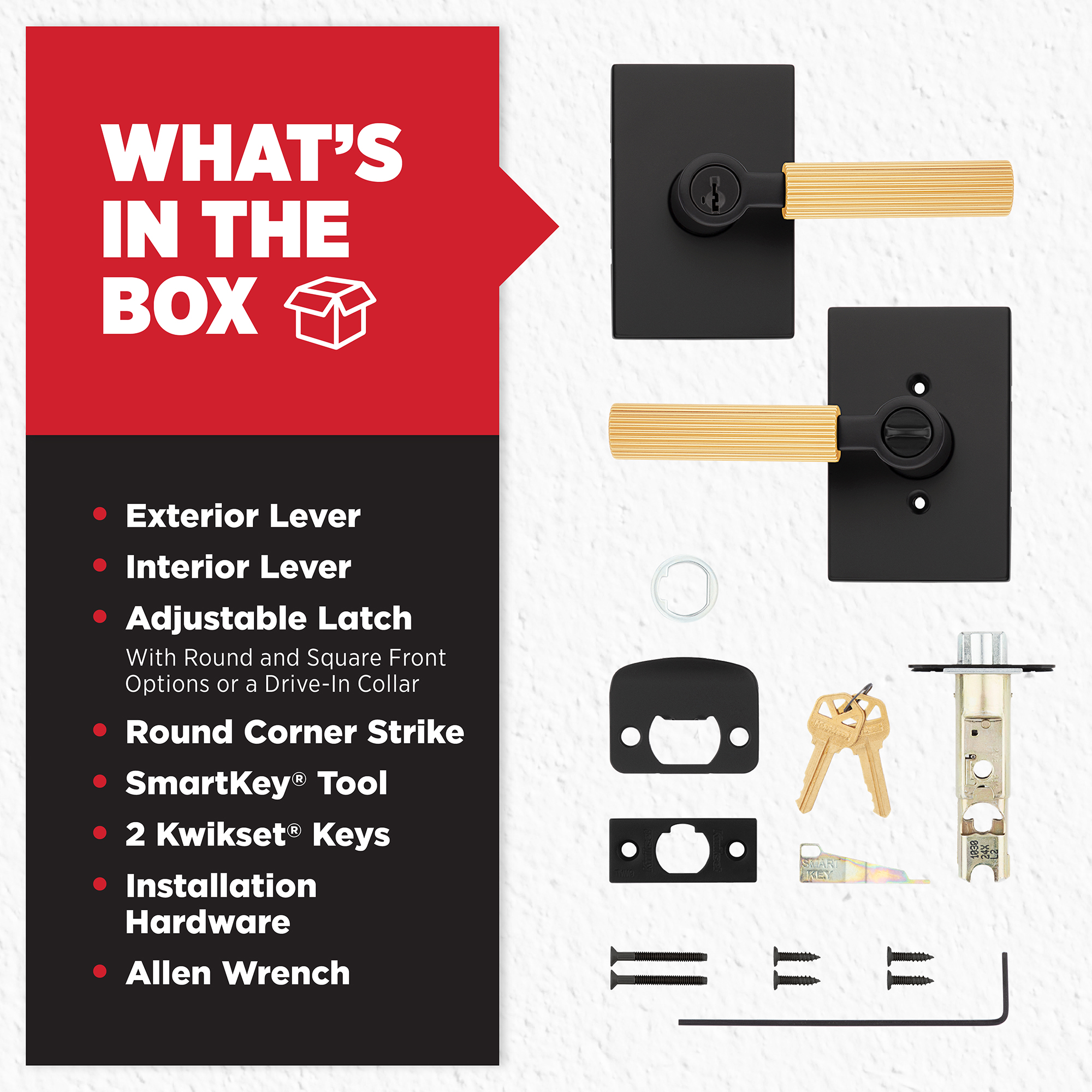 - Box Includes: Entry lever, Adjustable Latch with round front option or a drive-in collar, round corner strike, SmartKey tool, 2 Kwikset keys, installation hardware and Allen wrench